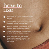 - How to Use - Ensure optimum effect by warming the oil before use. Apply a gentle, clockwise massage to your skin, abdomen, and thighs. Enjoy this calming self-care ritual to target discomfort and promote balance.