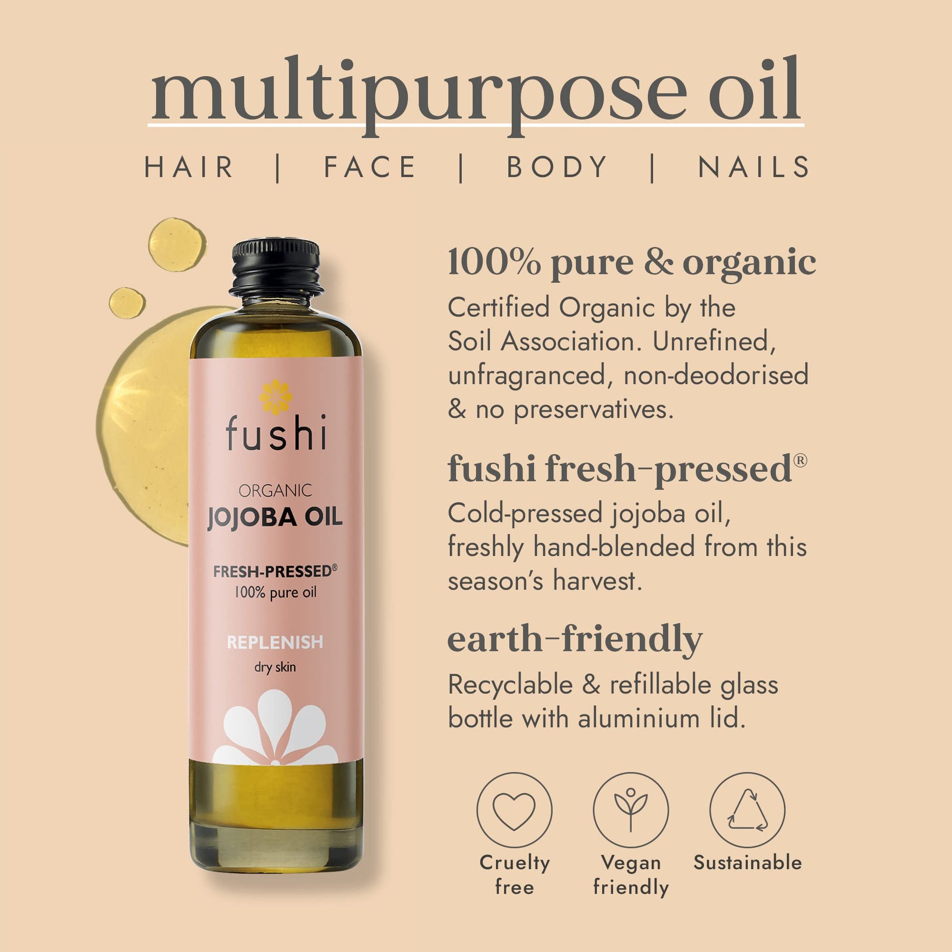 Fushi Organic Jojoba Oil 100 ml | Fresh-Pressed| Rich in Vitamin E | Best for Skin Cleansing, Dry Skin & Dry Hair | Hypoallergenic Oil | Ethical & Vegan Society Approved | Manufactured in the UK