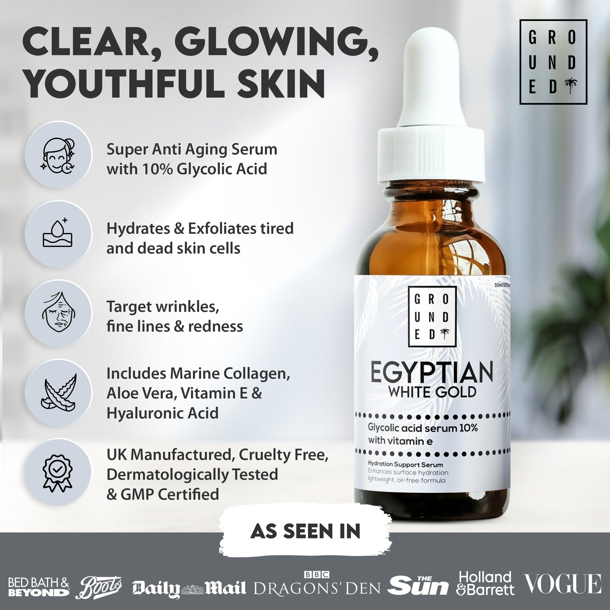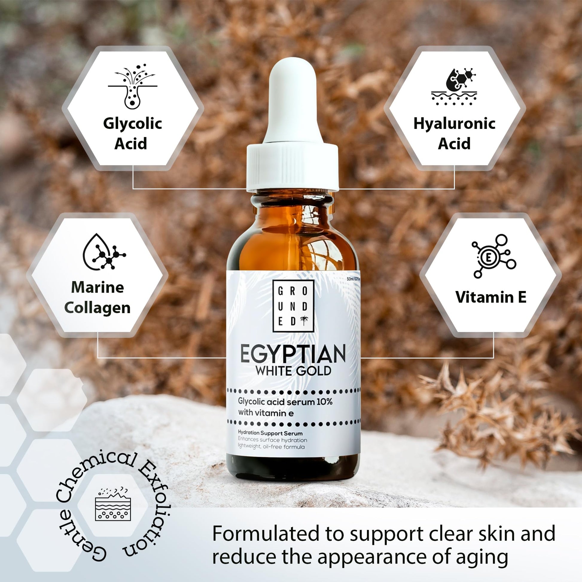 G R O U N D E D COFFEE SCRUB Egyptian White Gold Glycolic Acid Serum with Vitamin E, Anti-Aging Face Serum, Made in the UK by Grounded Body