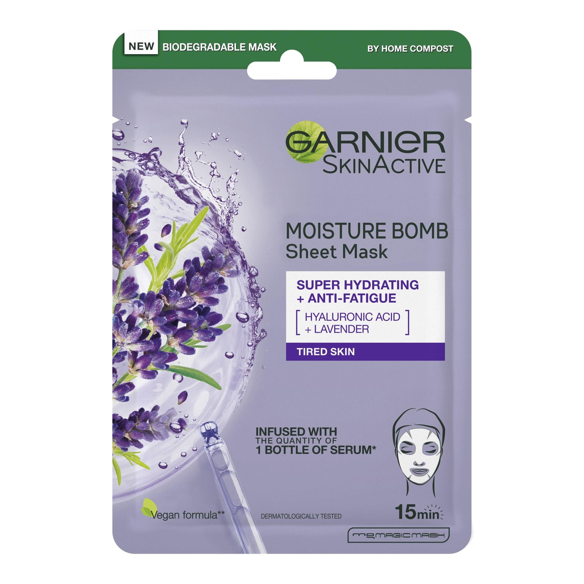 Garnier Moisture Bomb Lavender and Hyaluronic Acid Sheet Mask, Hydrating & Relaxing Face Mask, With Lavender Essential Oil To Revive Fatigued Skin, Biodegradable and Vegan Tissue, 28g