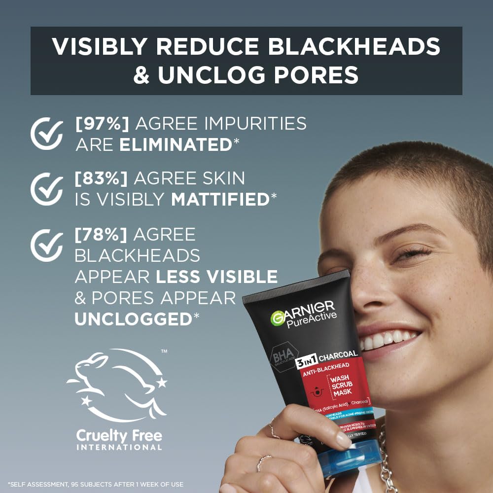 - GARNIER PURE ACTIVE 3IN1 CHARCOAL: Use as a daily wash, scrub or mask to visibly reduce blackheads in 2 weeks