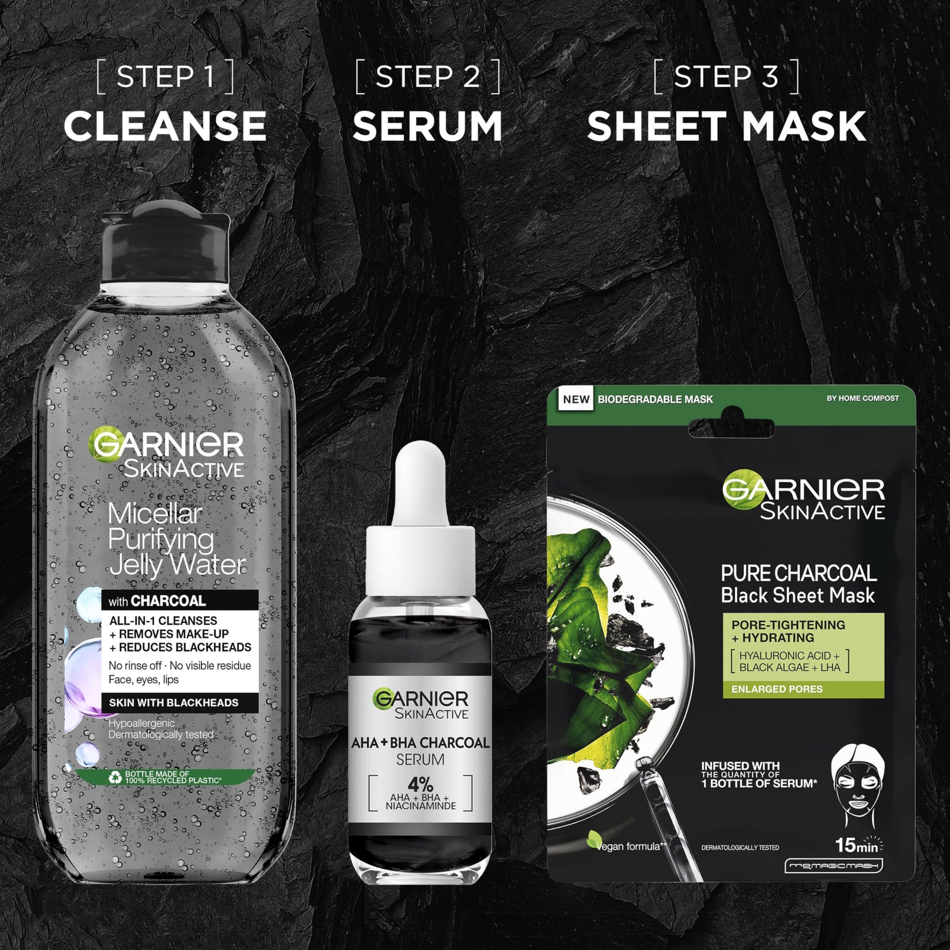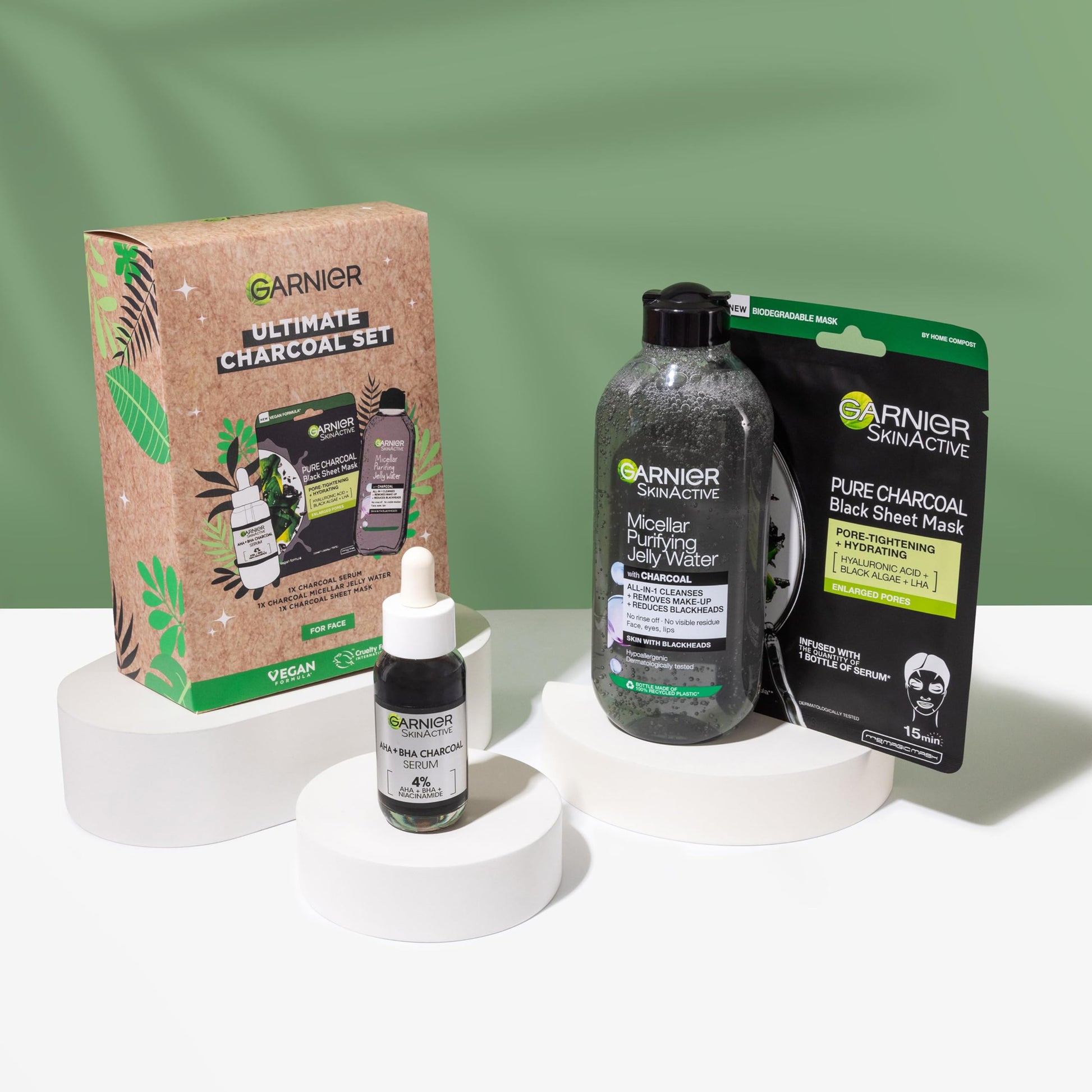 Garnier's Ultimate Charcoal Gift Set for Face, with Serum, Face Mask and Micellar Purifying Jelly Water to Reduce Imperfections, Approved by Cruelty Free International, Vegan