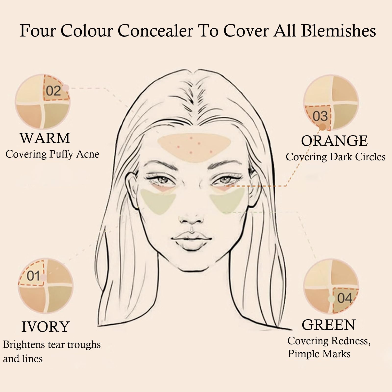 This 4-colour concealer palette contains four colours, the four colours can be mixed and used individually tocover a variety of imperfections such as acne and blemishes, pimple marks and redness and dark circles.