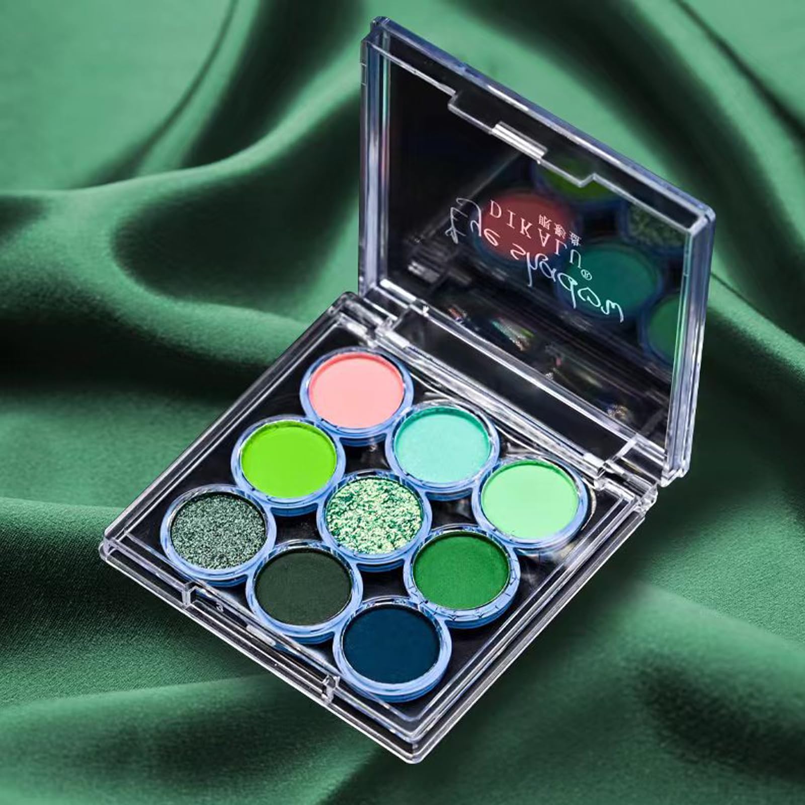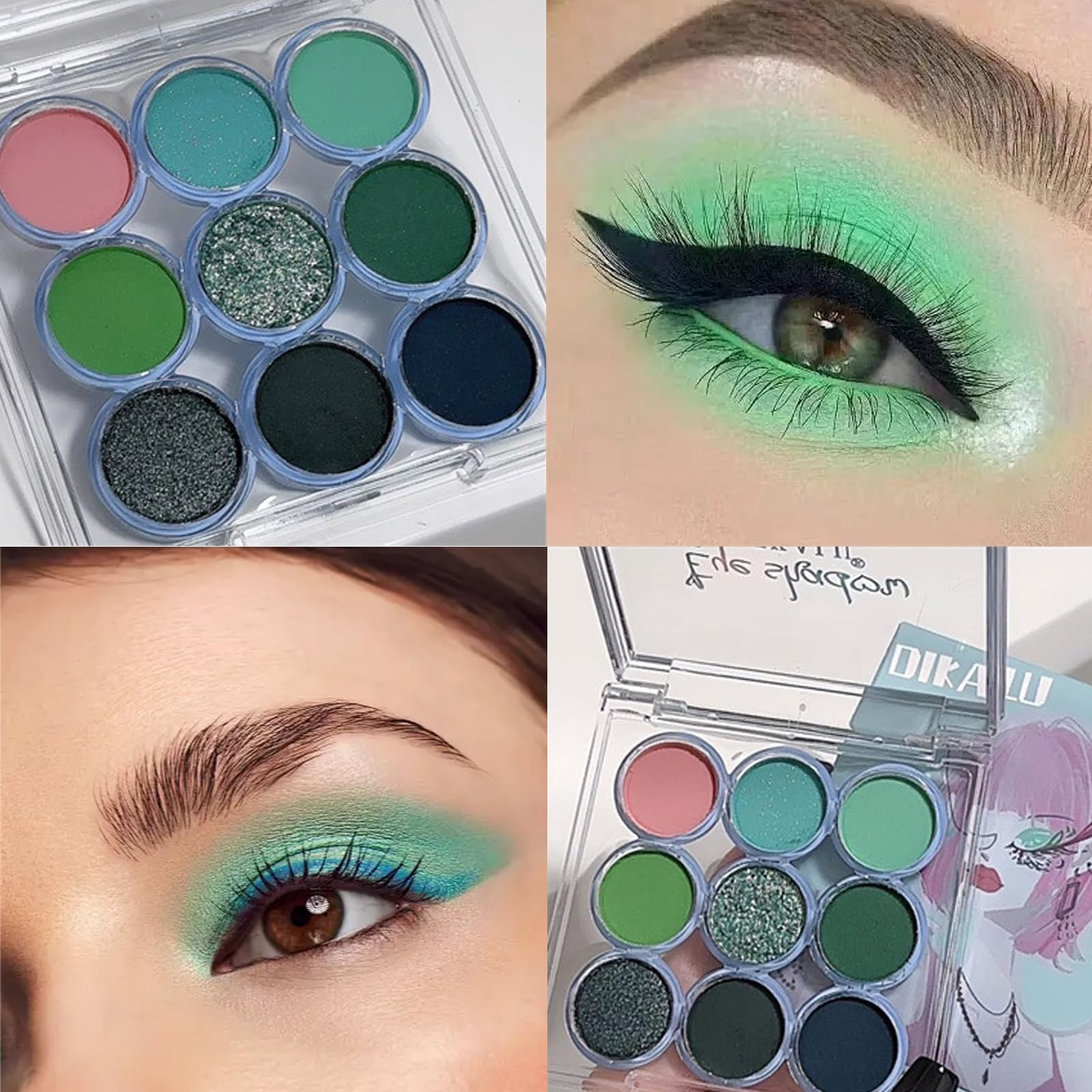 This cyan green eyeshadow palette contains 9 different shades of green, ranging from cyan green to dark green,in both matte and shimmery textures that are beautifully glamorous and create a dreamy and glamorous eye makeup look.