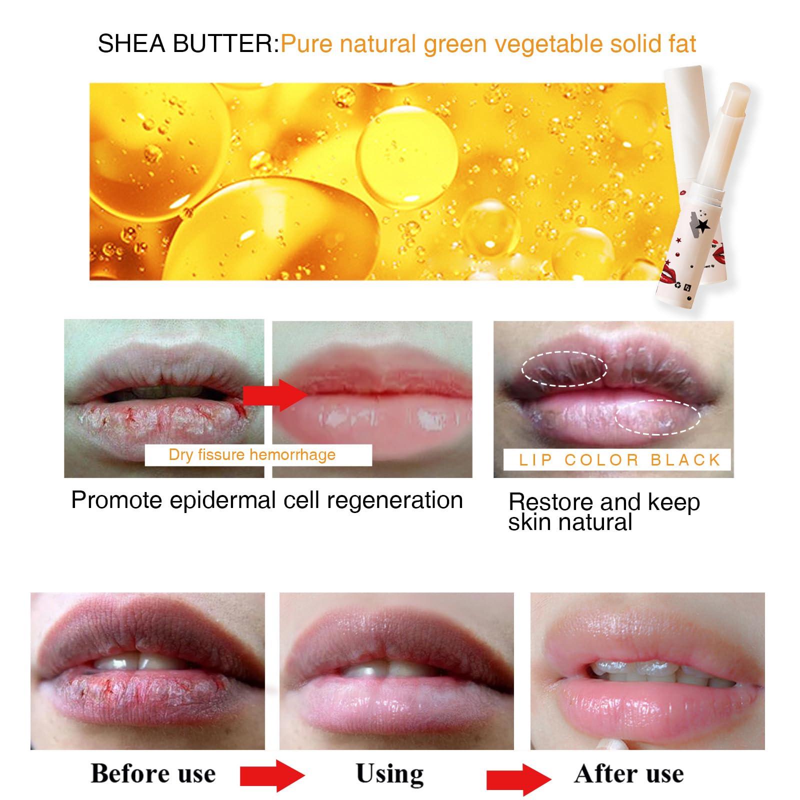 -This lip balm is made of natural shea butter extract, which is gentle and not easy to irritate the skin. It can continue to moisturise your lips and help to restore their vitality and elasticity, so you can use it without any worries.