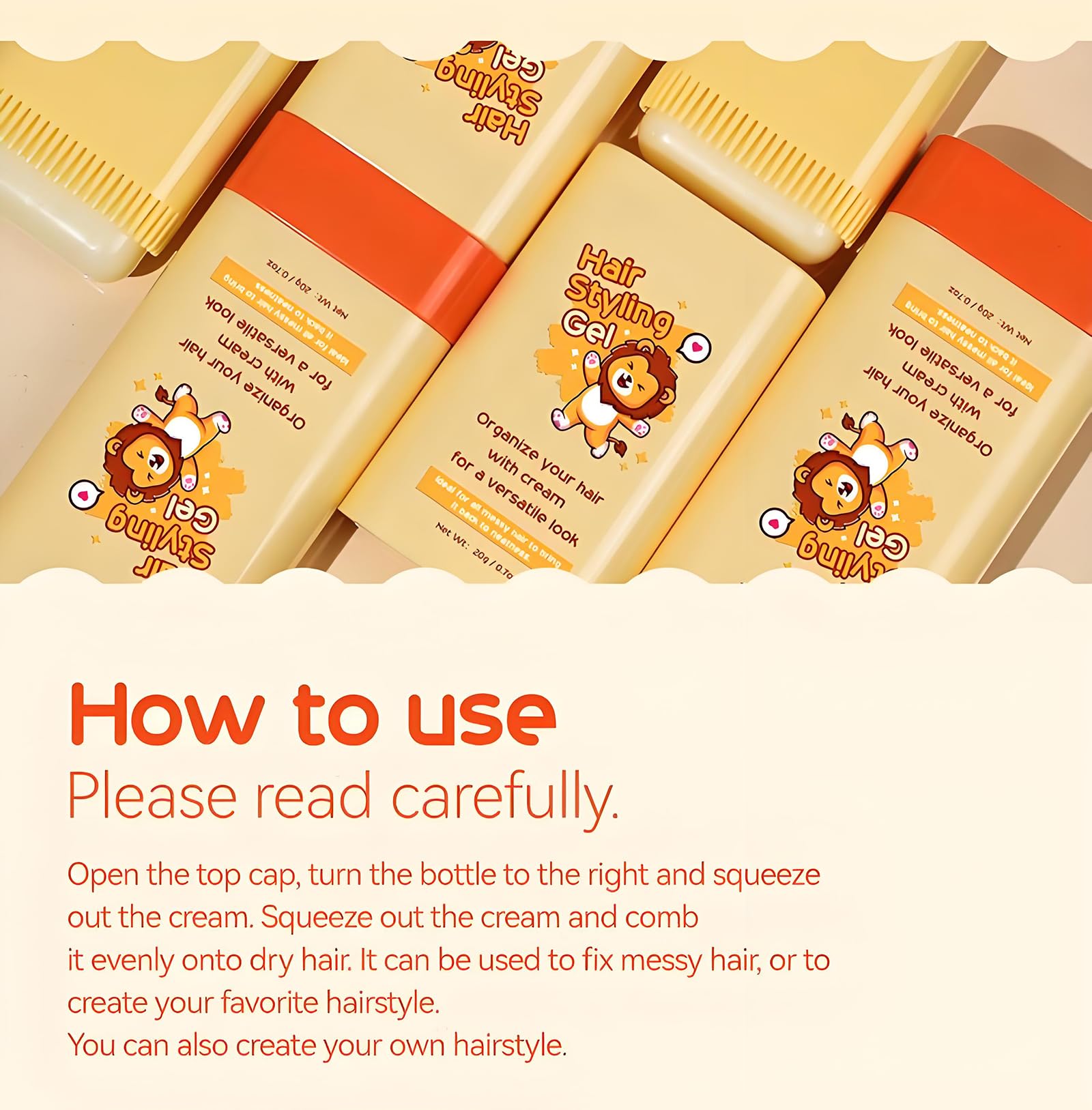 Adorable Hair Styling Stick for Kids 🌟 Transform your little one's look with this cute hair wax stick featuring fun cartoon designs! Our 2-in-1 styling stick combines a built-in comb and gummy wax gel formula for effortless hairstyling. Simply glide the hair stick through strands while combing to tame flyaways and create perfect slick back styles.🌸 Gentle & Safe for Kids: The non-sticky wax formula is specially designed for children's delicate hair and scalp. Lightweight yet effective, it provides all-day hold without stiffness or residue. Perfect for baby hair, toddler curls, and boys/girls styling needs!