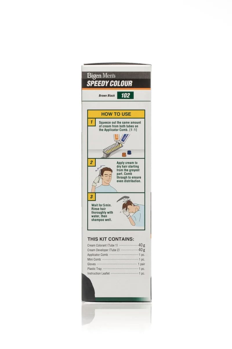 Bigen Men's Speedy Colour Brown Black 102 is a unique formula with conditioning agents (Olive oil, Glycerin and Pullulan) which gives natural shade, luster and moisture by penetrating deeply into each hair. Natural healthy looking results. No Ammonia. Hoyu have specialised in hair colouring for over 100 years, and with their slogan “colour your heart”, they are passionate about all their products and helping you find the perfect colour and coverage. Bigen Mens speedy colour has been developed to give a quick and easy application process to help give full grey coverage with long-lasting and effective results. Bigen mens speedy colour This formula has been created to help attend to grey hair and give long lasting results. With the 2 specially designed combs, it means it's easy to obtain effective results even in those hard to reach places.This range is also brilliant for touch ups and covering roots. Any remaining product can be stored and used when needed, meaning minimal waste and more cost effective. Safety Advice When using Bigen speedy hair colour or any other colourant it is important to always read and follow the instructions provided with the kit. An allergy test should be carried out 48 hours prior to hair colouring application. If side effects occur take necessary and appropriate action.More Info
