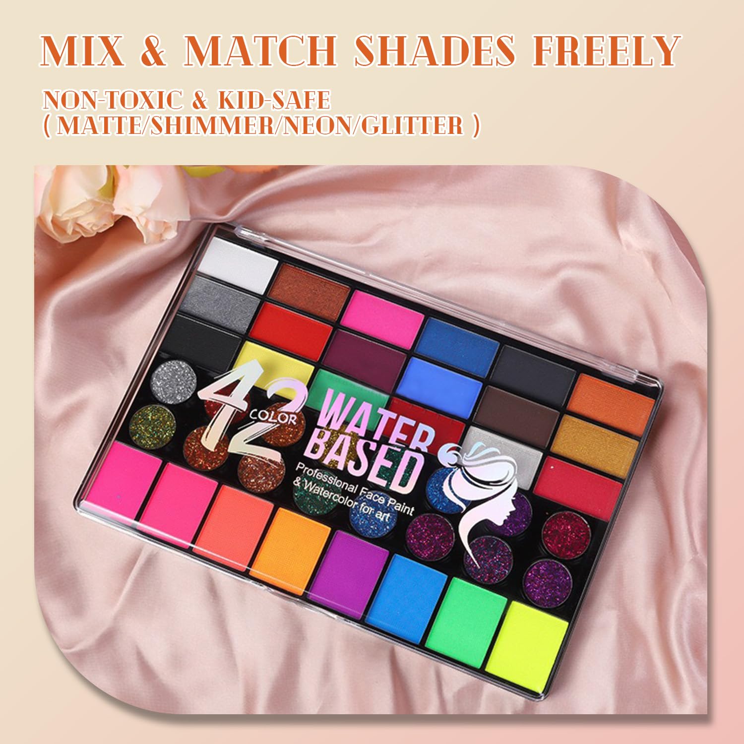 Generic Face Paint Kit for Kids & Adults β 42 Colors Water-Based Safe Non-Toxic Washable Makeup with Glitter & UV Effects β Halloween, Cosplay, Party β Includes 10 Brushes (42-colors)