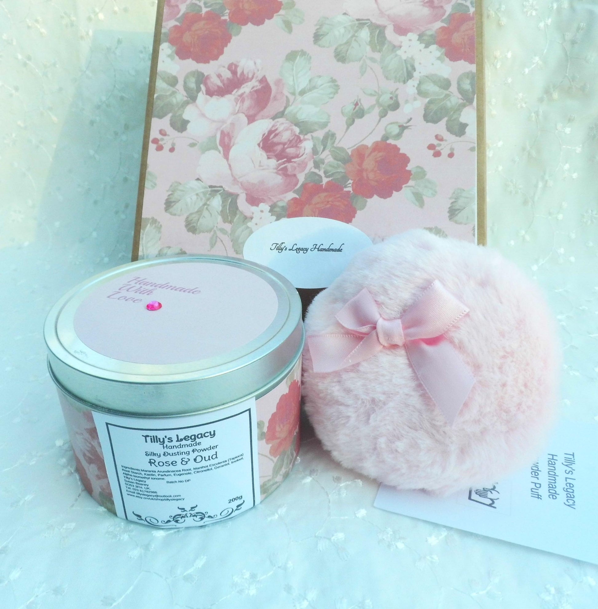 A Larger 200g size deluxe colloidal oat dusting powder has an improved and longer lasting silky feel. The skin is soft, silky and touchable for hours. Beautiful silky light powder, made from natural ingredients. No talc or cornflour. Made fresh and packaged to order. This fragrant powder enhances the skin, leaving a smooth and silky finish. Unlike Talc this will not dry or leave a chalky residue on the skin, best applied with a puff for a sheer silky finish and zero waste. A perfumed mild deodorant and will stop skin on skin chafing. Presented in an aluminum tin, to prevent the fragrance fading, with a 3 inch mini puff in a pretty craft box and ready to gift. Rose & Oud - This has a warm sweetness mixed with woody and balsamic notes. An aromatic and complex scent to die for. Long lasting and lingering. Notes similar to the designer fragrance which is so popular.More Info
