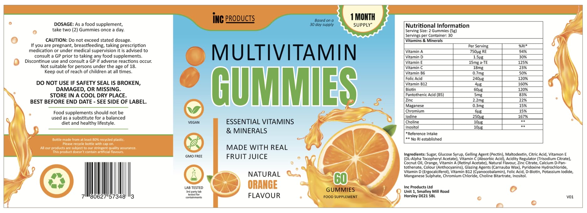 Natural Orange Multivitamin and Mineral Gummies, Made with only 100% Natural Ingredients, Gluten Free, Vegan, GMO Free. Great tasting Orange Gummy to boost for your Vitamin and Mineral intake. Based on 2 Gummies per day the container has a 1 month supply. reccommended daily dose is 2 gummies daily, but can be increased for the more active person. Increase your wellbeing and general health with this powerfull multivitamin and Mineral GummyMore Info