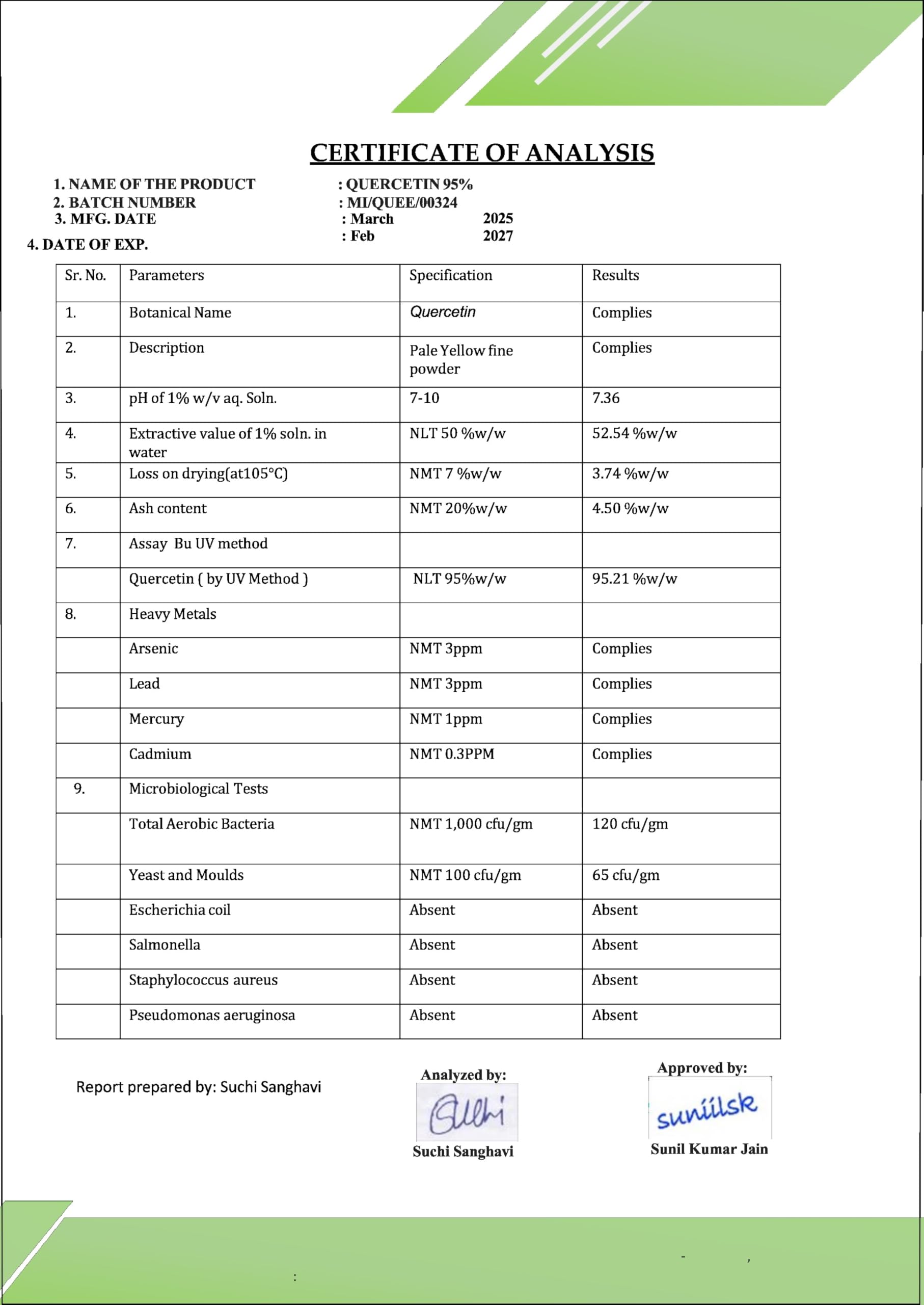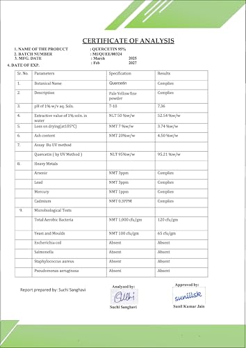 Elevate your wellness routine with our 99% Pure Quercetin Powder, meticulously sourced from trusted suppliers and rigorously tested for potency and purity. This bioactive flavonoid is extracted from premium plant sources, offering a vegan-friendly, non-GMO supplement ideal for holistic health enthusiasts, athletes, and natural wellness advocates. Key Benefits (Compliant with Amazon Guidelines): ✔️ Antioxidant Powerhouse: Supports cellular health by neutralizing free radicals (a general function of antioxidants). ✔️ Bioactive & Bioavailable: Enhanced for optimal absorption to integrate seamlessly into daily health rituals. ✔️ COA Verified: Every batch is third-party lab-tested for purity, ensuring no fillers, artificial additives, or contaminants. ✔️ Vegan & Gluten-Free: Crafted for clean, plant-based lifestyles. Why Choose Us? Trusted Quality: Backed by a Certificate of Analysis (COA) for transparency. Versatile Use: Easily mix into smoothies, juices, or water for daily support. Ethically Sourced: Sustainably harvested and processed in small batches for maximum potency. Perfect For: Natural wellness enthusiasts seeking antioxidant support. Active lifestyles focused on holistic vitality. Anyone prioritizing clean, lab-certified supplements. Suggested Use: Add 250–500 mg daily to your favorite beverage. Consult a healthcare professional before use.More Info