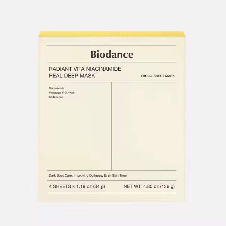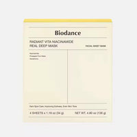 Unlock your skin's radiant potential with the Radiant Vita Niacinamide Real Deep Mask, a revolutionary Korean skincare innovation designed to deeply nourish, brighten, and even out your complexion. This unique facial sheet mask is formulated with a powerful blend of key ingredients to tackle common skin concerns, leaving you with a coveted "glass skin" glow. Key Benefits You'll Love: Target Dark Spots & Hyperpigmentation: Infused with Niacinamide, a powerhouse ingredient known for its ability to visibly reduce the appearance of dark spots, sun spots, and post-acne marks, promoting a more uniform skin tone. Brighten & Improve Dullness: Experience a luminous transformation as this mask works to combat dull, tired-looking skin. The potent combination of ingredients helps to revitalize your complexion, revealing a natural, healthy radiance. Achieve Even Skin Tone: Say goodbye to unevenness! This mask helps to balance and refine your skin's texture, leading to a smoother, more harmonious appearance. Unique "Real Deep" Absorption Technology: Unlike traditional sheet masks that leave a watery residue, the Biodance Real Deep Mask is designed for maximum absorption. Over 3-4 hours, the mask becomes completely transparent as all the nourishing essence is absorbed into your skin, leaving no sticky feeling behind. Versatile Application - Overnight or Daytime: Overnight: Apply at the end of your evening skincare routine and wake up to intensely hydrated, glowing skin. Daytime: For a quick boost, apply after toner or cream and leave on for 3-4 hours until transparent for a deep treatment. Potent Ingredient Blend: Niacinamide (Vitamin B3): Brightens, reduces dark spots, improves skin barrier function. Pineapple Fruit Water: Provides gentle exfoliation and helps to enhance skin clarity and brightness. Glutathione: A powerful antioxidant that supports skin brightening and protects against environmental stressors. Convenient 4-Sheet Pack: Each box contains 4 individually wrapped sheet masks, perfect for consistent weekly treatments or for preparing your skin for a special occasion. Experience the difference of a mask that truly absorbs and transforms your skin. Add the Biodance Radiant Vita Niacinamide Real Deep Mask to your skincare regimen today and unveil your most radiant, even-toned complexion!More Info