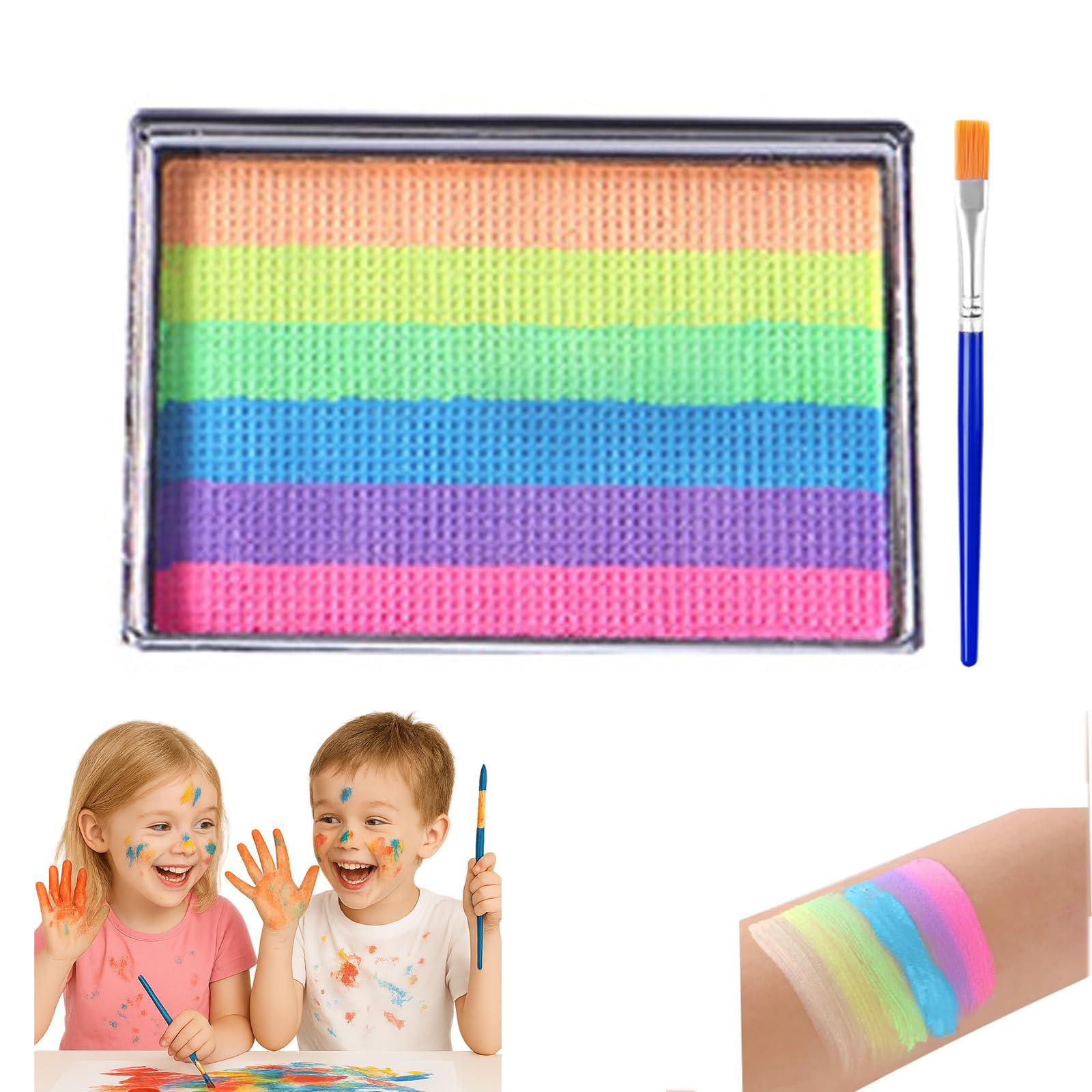 <strong>Vibrant Rainbow Face Paint Kit</strong> - Perfect for festivals, pride events, and creative play! ✨🌸 Our <strong>6-color water-activated face paint</strong> palette delivers <strong>bright, long-lasting colors</strong> that won't smudge or fade. <br><br>💖 <strong>Waterproof & sweatproof formula</strong> stays vibrant through hours of wear while being <strong>gentle on sensitive skin</strong>. The <strong>non-toxic, odor-free</strong> paints pass safety tests and wash off easily with water. <br><br>🦋 Includes professional brushes for precise <strong>face painting</strong> and <strong> art</strong> designs. The <strong>quick-drying rainbow face paint sticks</strong> are ideal for cosplay, sports events, and stage performances. <br><br>How to use:<br>1️⃣ Dampen brush and pick up from <strong>face paint palette</strong><br>2️⃣ Apply smoothly to skin<br>3️⃣ Layer colors for <strong>rainbow effects</strong><br>4️⃣ Let dry completely before touching<br><br>🌻 Portable 25g <strong>face painting kit</strong> with <strong>6 vibrant shades</strong> fits perfectly in your festival bag. Create stunning <strong>clown makeup</strong> or <strong>LGBT pride designs</strong> with this versatile set! 💫🍃More Info