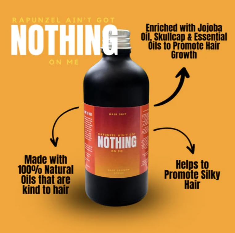 π§ Enriched with Jojoba Oil, Skullcap & Essential Oils to Promote Hair Growth β¨ Helps to Promote Silky Hair π± Made with 100% Natural Oils that are kind to hair Rapunzel Ain't Got Nothing on Me is a hair oil treatment that is formulated with jojoba oil to promote healthy hair growth. With regular use, this oil helps to strengthen and nourish hair for a longer, thicker appearance. Get stronger, thicker hair with this natural and effective treatment. This 100ml bottle of hair growth serum contains the scientifically proven benefits of lemongrass essential oil, promoting long-term, strong hair growth. Experience Rapunzel-like results after regular use. Our oil blend contains beneficial ingredients like coffee oil that helps promote faster growth and stronger hair strands. Use this product for luxurious and healthy locks that won't break, split, or tangle easily. INGREDIENTS: Simmondsia Chinensis (Jojoba) Seed Oil, COFFEA ARABICA SEED OIL, Cocos Nucifera (Coconut) Oil, Cymbopogon Flexuosus Oil & Scutellaria Baicalensis (Biakal Skullcap) Root Extract **Also contains geraniol, linalool, linalylacetate which are naturally occurring in essential oils.More Info