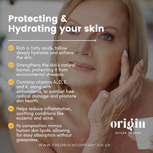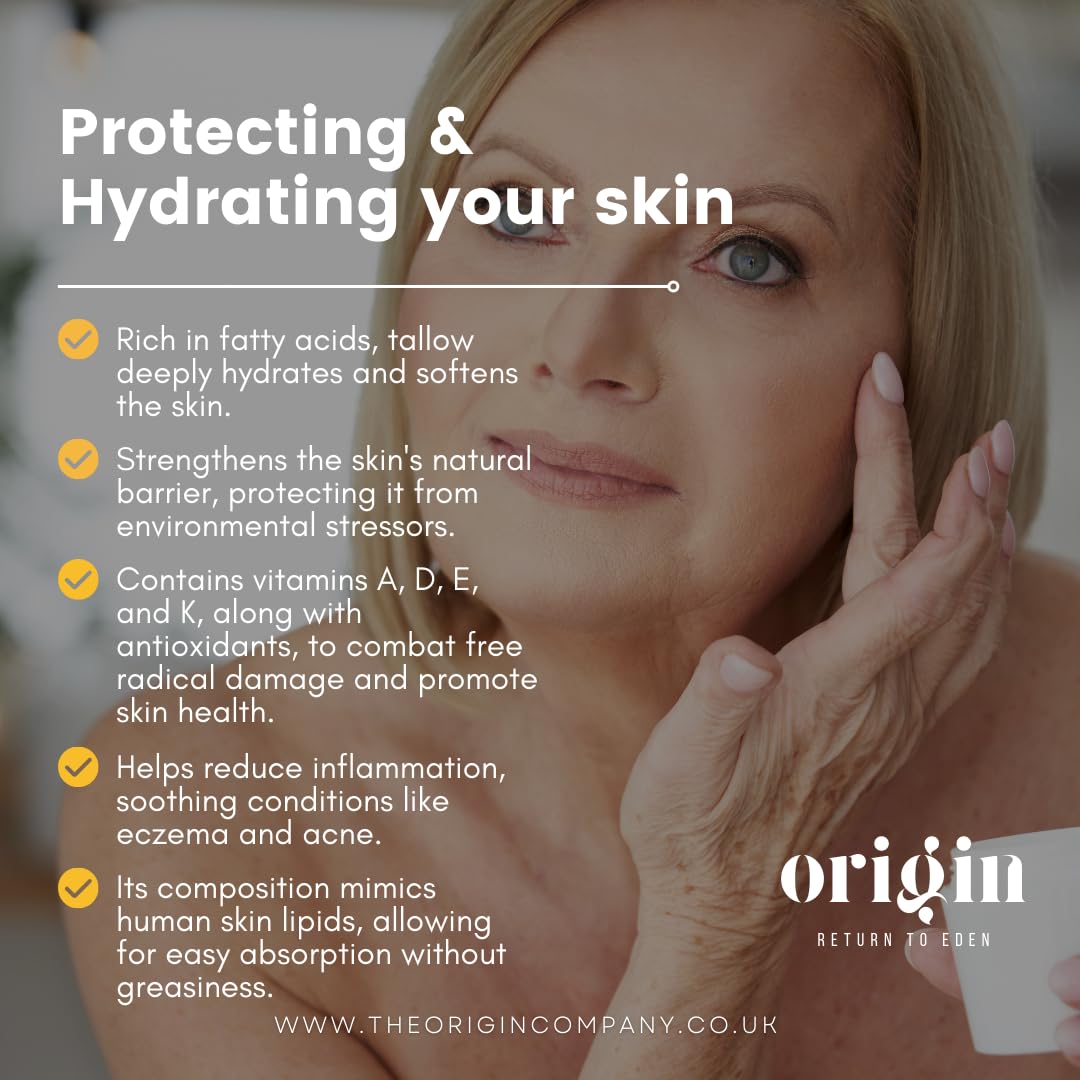 EXCEPTIONAL BENEFITS OF TALLOW - Tallow is composed of fatty acids similar to those found in human skin, including oleic, stearic, and palmitic acids. This unique composition allows tallow to deeply penetrate the skin, providing superior hydration and nourishment. Scientifically, these fatty acids help restore and maintain the skin's natural barrier, improving moisture retention and reducing dryness. Research indicates that tallow’s fatty acid profile is effective in supporting skin health, enhancing its ability to repair and protect against environmental stressors. Embrace the natural synergy between tallow and your skin for a truly revitalising skincare experience