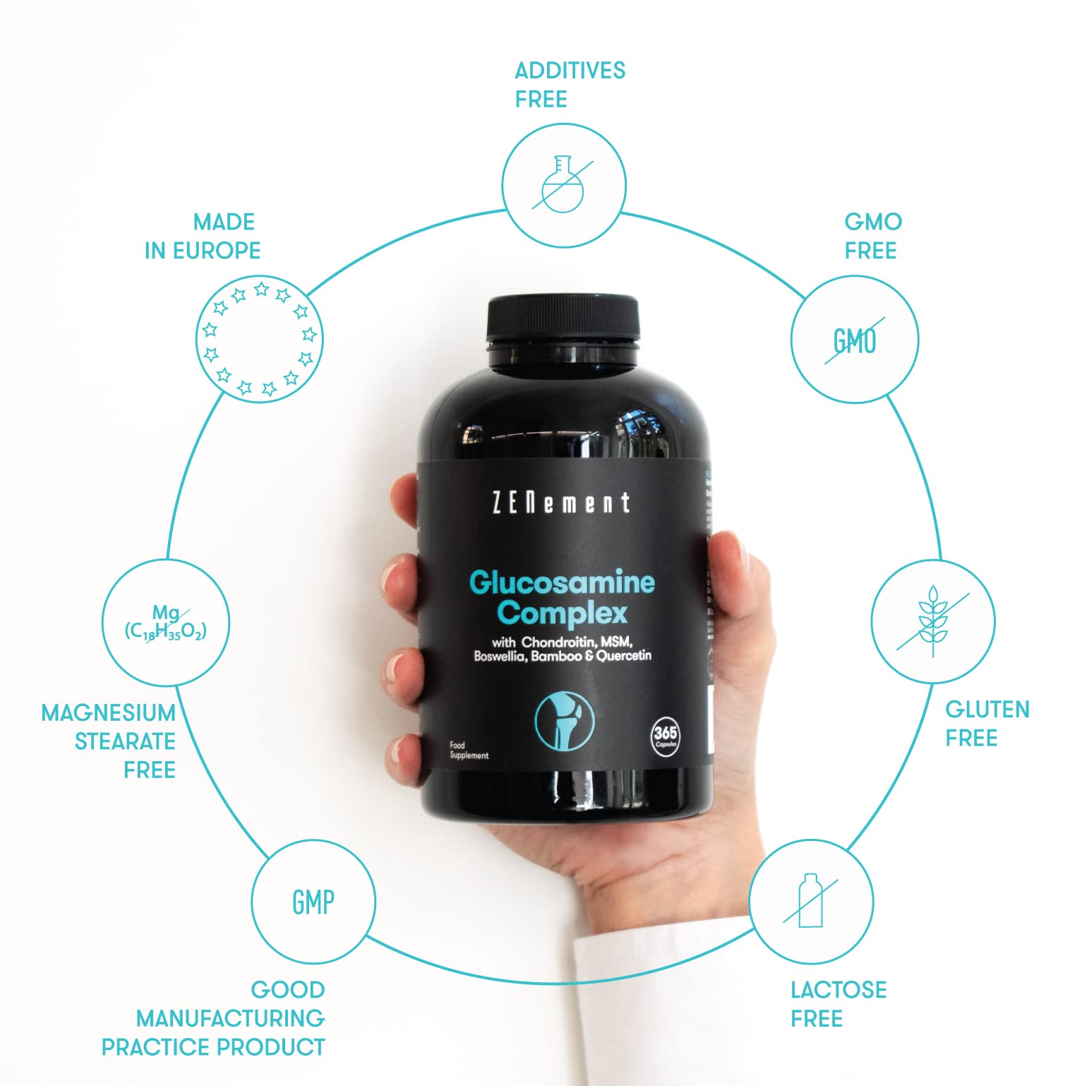 Glucosamine and Chondroitin Complex, 365 High Strength Capsules (1 Year Supply) | with MSM, Boswellia, Bamboo & Quercetin | Maintains Normal Joint Cartilage | Zenement