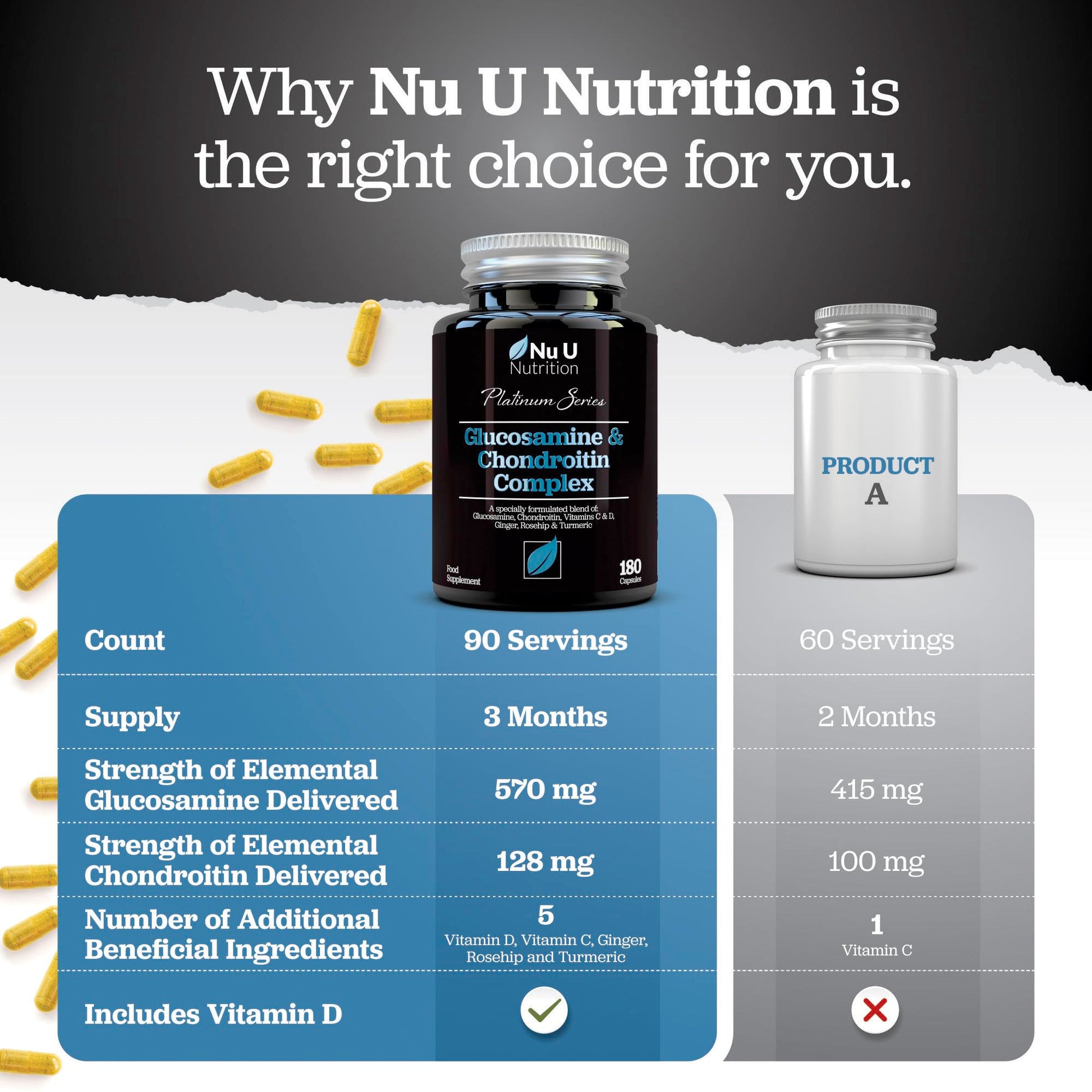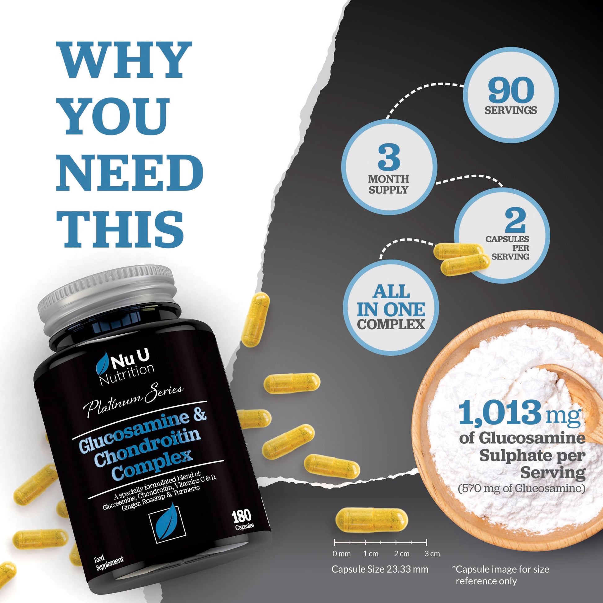 - ✔ 3 MONTH SUPPLY - Our premium Glucosamine and Chondroitin high strength supplement is very cost effective. Each bottle contains 180 capsules with a recommended 2 capsules per serving size, giving you a 3 month supply. Don’t settle for other Glucosamine supplements that provide less servings or ingredients for your money.