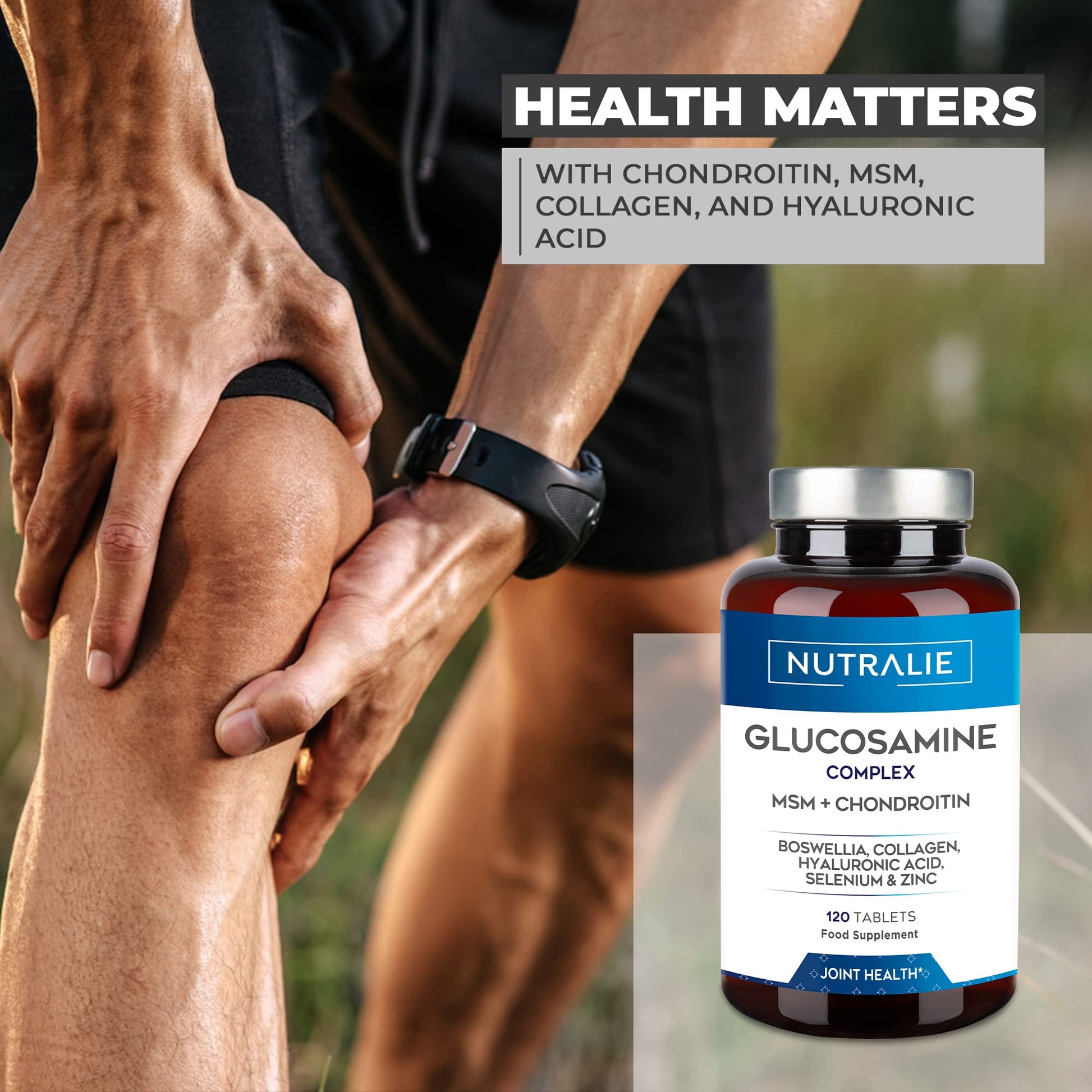 - šŖ GLUCOSAMINE AND CHONDRIOTIN HIGH STRENGH COMPLEX: Glucosamine and chondroitin are part of normal cartilage and play an important role in its formation and repair. Nutralie's supplement in 120 tablets contains 1000 mg of glucosamine and 500 mg of chondroitin both in sulphate form in each dose. To reinforce its action, 450 mg of methylsulfonylmethane (MSM) and 80 mg of hydrolyzed collagen are added to the formula for every two tablets taken.