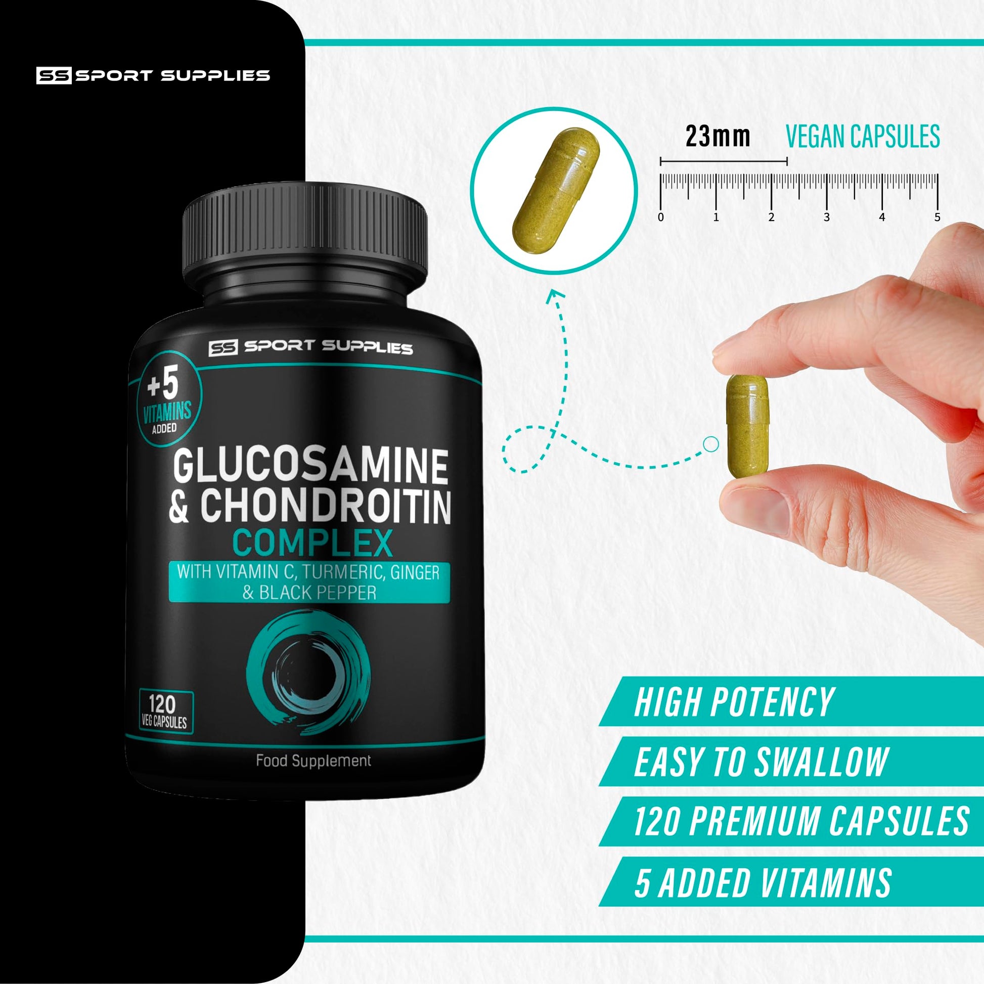 Glucosamine and Chondroitin High Strength Plus 5 Vitamins - 120 Complex Capsules 1,000mg (Providing 530mg Base) - Chondroitin 200mg - Added Turmeric, Ginger, Black Pepper, Vitamin C, B6, B1, D3 & B12