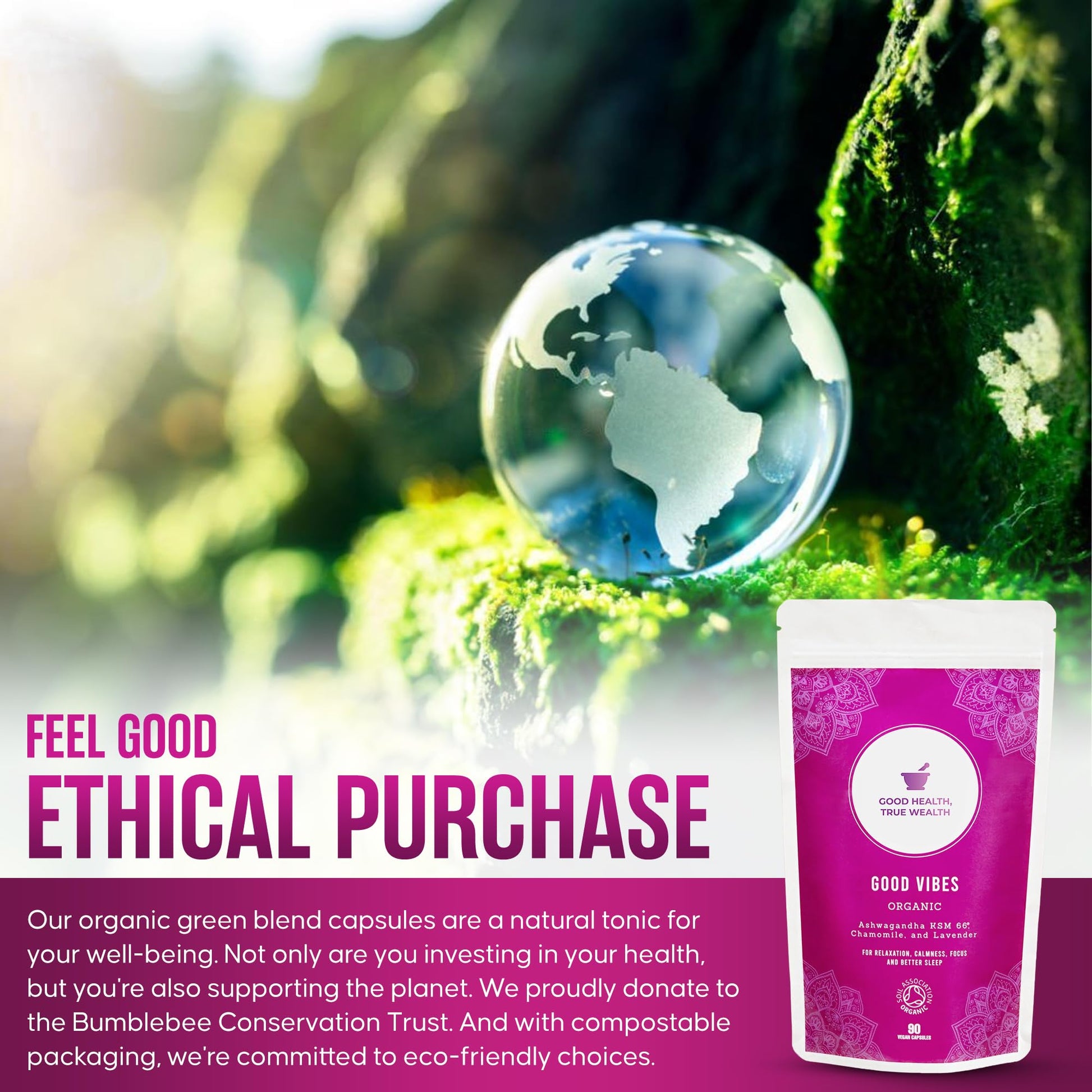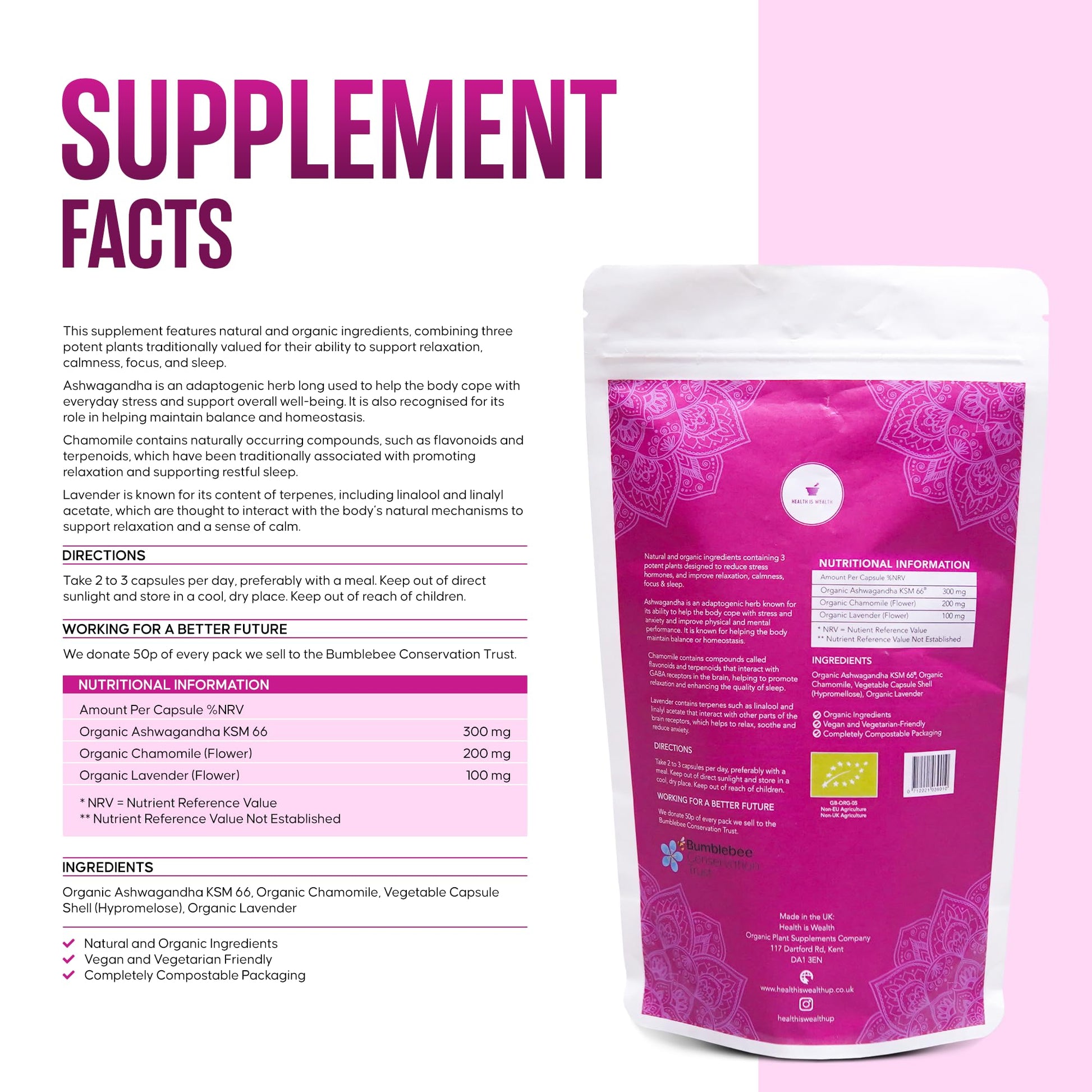 90 Vegan Capsules. This unique supplement blends multiple potent organic herbal ingredients, carefully selected for their well-known properties. Our formula includes Organic KSM 66 Ashwagandha, Lavender, and Chamomile. These ingredients have been traditionally used for their calming qualities, promoting relaxation and overall well-being. Many people who incorporate these herbs into their routine report feeling more at ease and balanced over time. Our product contains 300 milligrams of Organic KSM 66 Ashwagandha, 200 milligrams of Organic Chamomile, and 100 milligrams of Organic Lavender. Completely organic and natural – even the capsule shells are made from plant fibers. Organic plants are grown without pesticides and fertilisers, preserving the plant’s natural characteristics and their contribution to a sustainable environment. At Good Health True Wealth, we prioritise the environment. That’s why we’ve ensured our packaging is 100% compostable, leaving no harmful waste behind. We also recognise the importance of bees in our ecosystem, as they pollinate 75% of essential food crops. To support their vital role, we donate 50% of every sale to the Bumblebee Conservation Trust.More Info