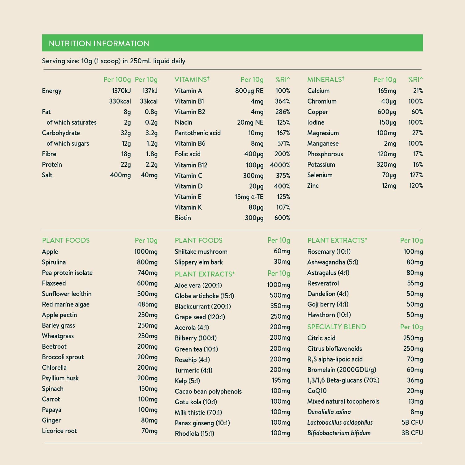 Nuzest are passionate about creating convenient, premium nutritional supplements. Our 120g Good Green Vitality powder is a complex, multi-nutrient formula with over 75 high quality vitamins, minerals and other essential nutrients. Our vegan, green powder is made from a potent blend of carefully selected fruits, vegetables and herbs. This quick, tasty and convenient green powder helps you look and feel your best! Simply mix 1 scoop (10g) into 250ml of water or juice and enjoy! Our fine, green powder does not require a blender or mixer, simply shake and go. Enjoy a quick, easy green drink everyday!More Info