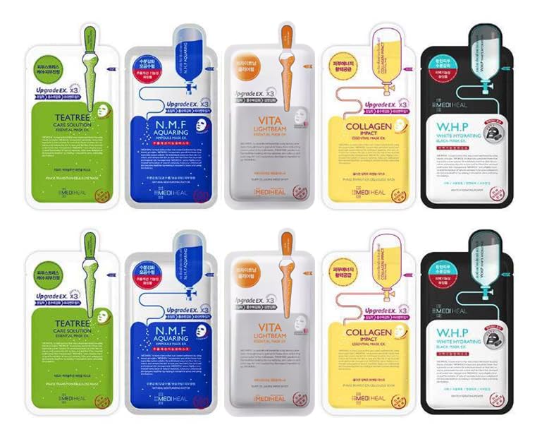Grehge heet Mask Bundle N.M.F Aquaring Ampoule + Collagen Impact + Teatree Care + E.G.T Timetox Ampoule EX + W.H.P White Hydrating Black EX, 2pcs Each, 5 Different Masks, Totally 10 Sheets