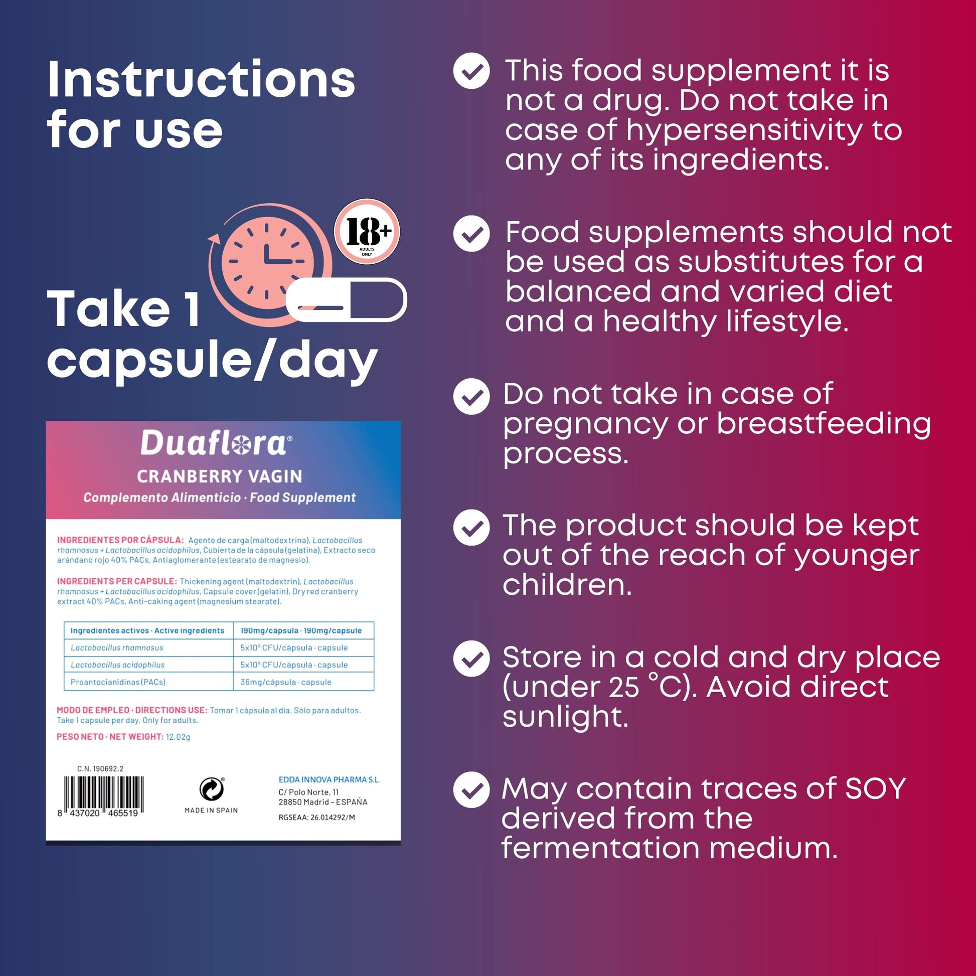 - What is the mode of taking? WITH DUAFLORA CRAMBERRY VAGIN YOU ONLY NEED TO TAKE ONE CAPSULE A DAY compared to other products where you have to take 2 capsules a day. Do not exceed the expressly defined dose. For adults only.