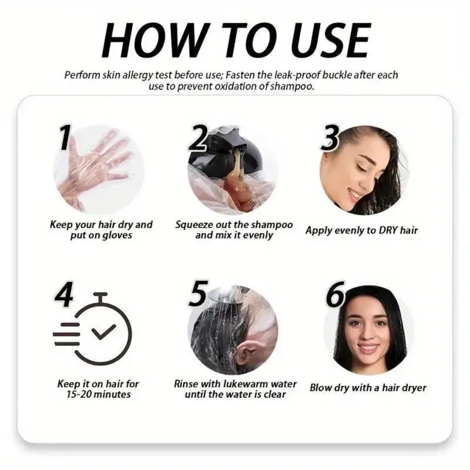 3.Before using our black hair dye water, you can conduct a skin sensitivity test first.