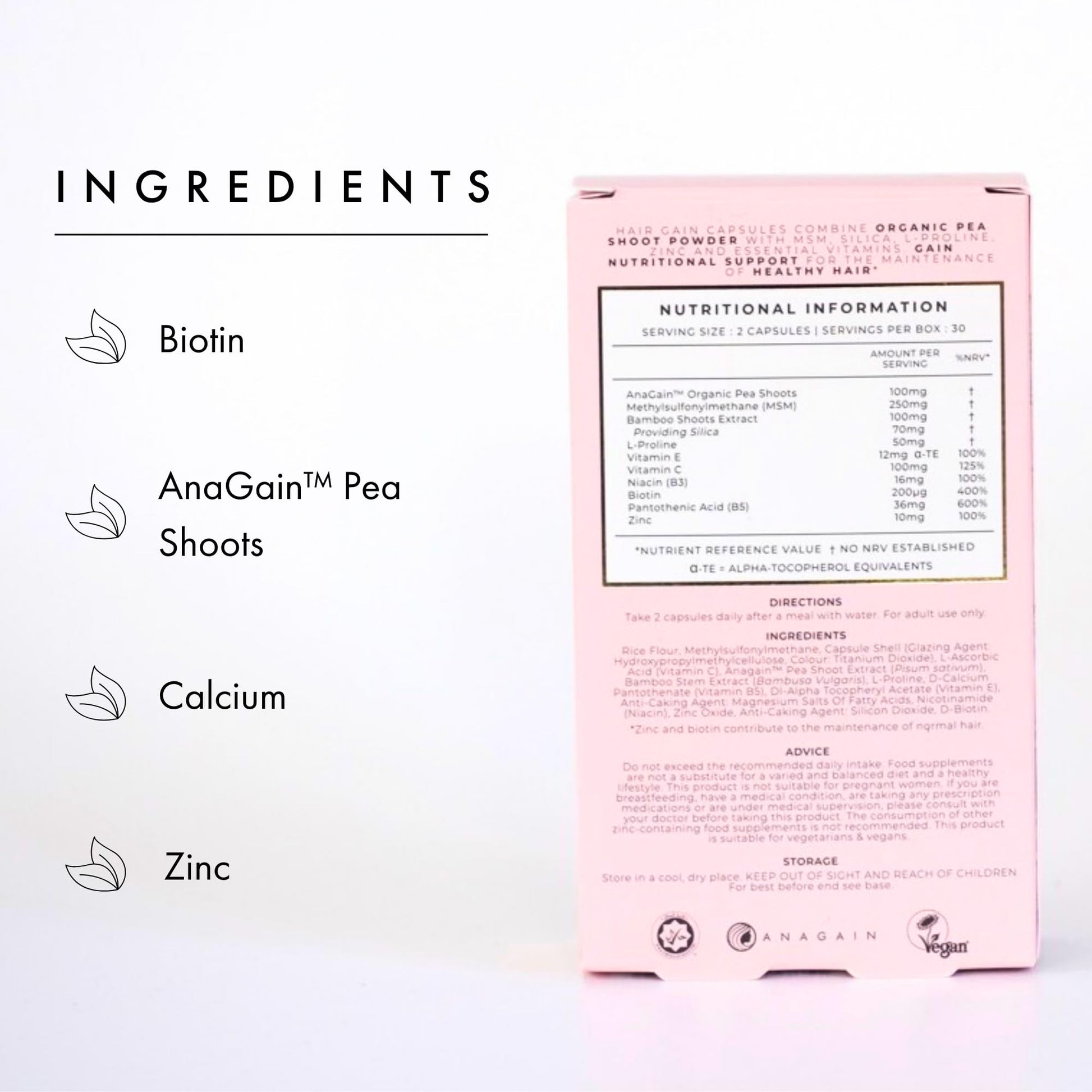 Worried about hair loss? Losing your hair can be terrifying, but it is more common than you might think. By the age of 50, a quarter of all women and half of all men are affected by hair loss. Causes include stress, anxiety, post-pregnancy, hormonal fluctuation, age, poor diet and over-styling. GROW by Hair Gain is here to help. Take 2 capsules daily after a meal with water GROW by Hair Gain contains the exclusive AnaGain ingredient derived from the organic pea shoot The pea shoot is small but mighty when it comes to hair loss, its powerful phytonutrients stimulate fuller and thicker hair at the root Scientifically formulated with a blend of vitamins, minerals, botanical and aminos vital for healthy hair GROW by Hair Gain contains Zinc and Biotin, which help to maintain healthy hair growth from within Get visibly thicker and fuller hair in just one month Get great looking hair, GROW restores vitality and shine Stimulates hair follicles at source Vegan certified Halal certifiedMore Info