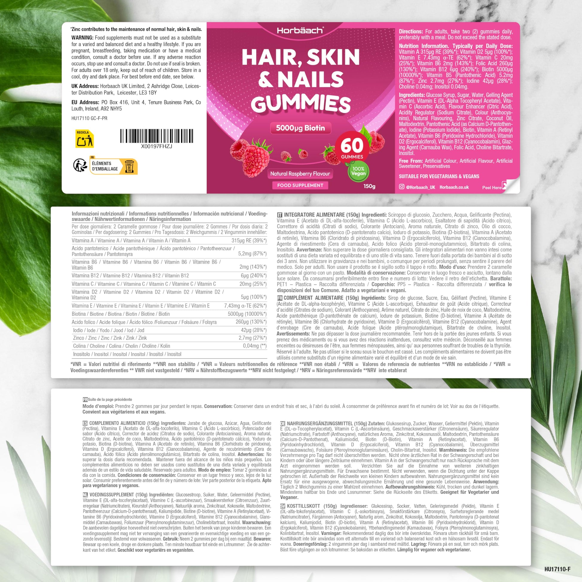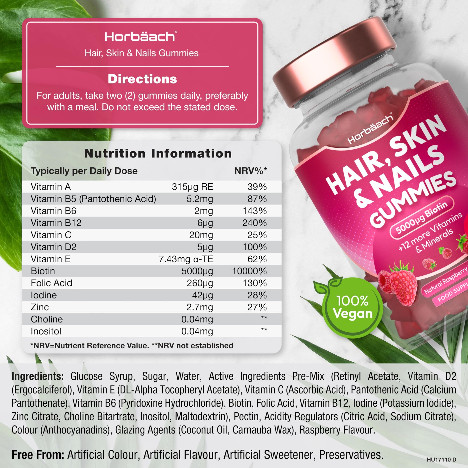 Ready for a glow-up? Try Horbaach Hair, Skin & Nails gummies! Horbaach Hair, Skin & Nails Gummies are specially designed to support healthy hair, skin & nails from the inside out. Our gummies are a complex of multivitamins and minerals that all aid in beauty care routine. Enriched with a blend of Vitamin C, E and Biotin - 3 essential vitamins in one supplement which all contribute to the maintenance of normal hair, skin and mucous membranes. Super delicious vegan and naturally flavoured gummies that not only strengthen hair, skin & nails but are also packed with essential vitamins to support your immune system and energy through combating tiredness and fatigue. There's no better formula out there, simply take 2 gummies morning or night and reap the benefits of this amazing vitamin & mineral complex!More Info