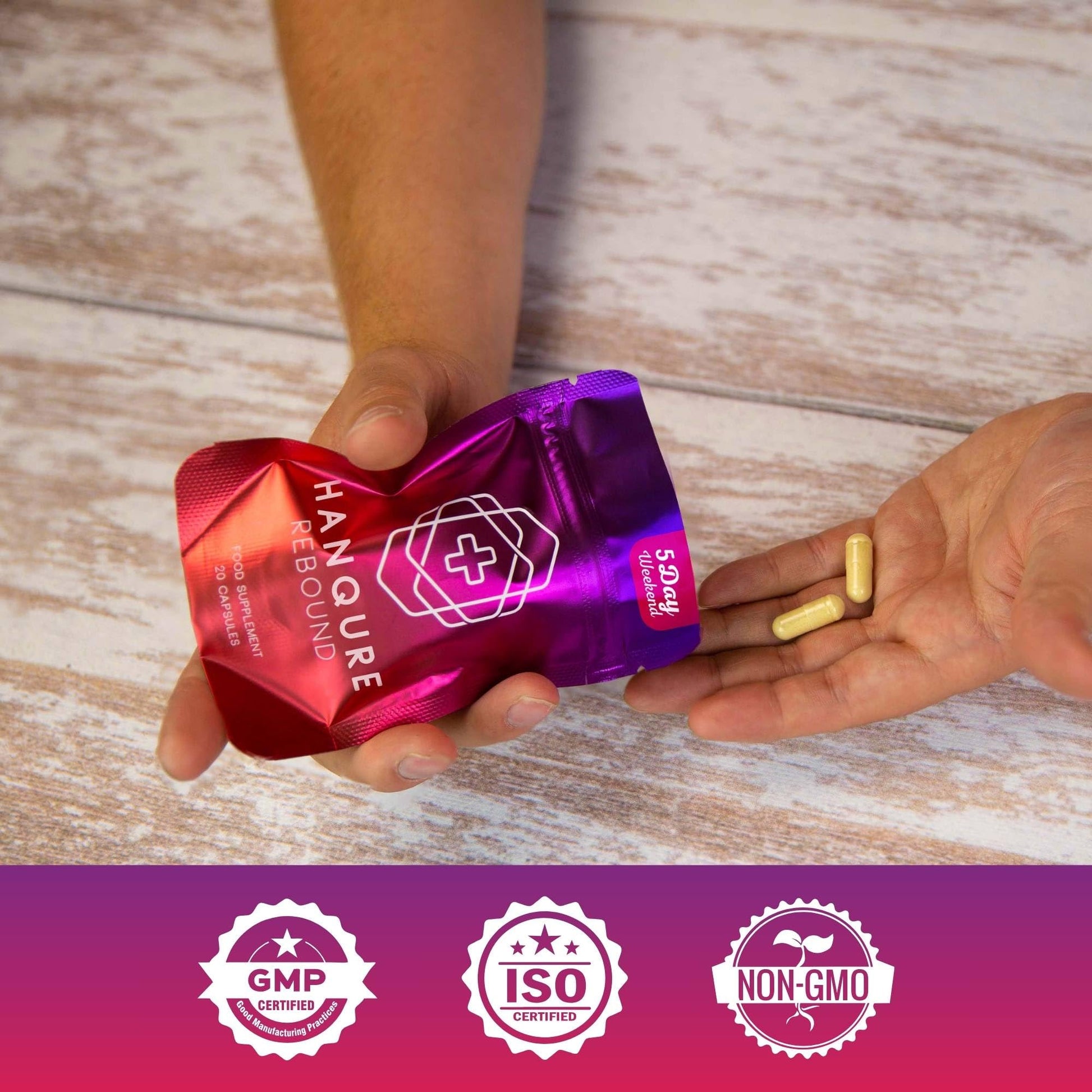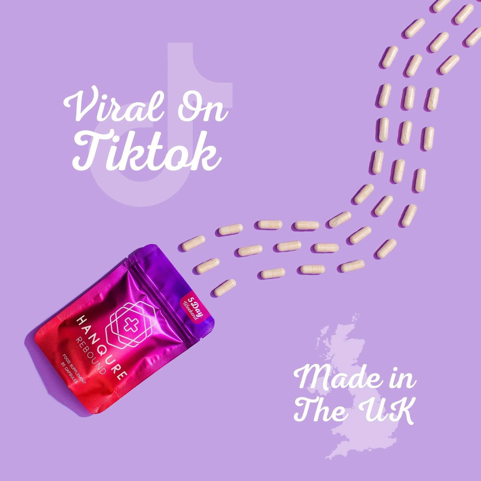 Rebound by Hanqure – Trusted by Over 200,000 People. Formerly known as Hangcure, Rebound by Hanqure brings you the same trusted formula with a refreshed name and look. The formula also includes a blend of essential B vitamins—B1, B2, B6, and B12. Enhanced with Rosemary Leaf Extract and Vitamin C. We've also included Magnesium Citrate to round out the formula with essential minerals. Rebound is made with clean, vegan-friendly ingredients and contains no artificial colours, fillers, or unnecessary additives. Each pouch contains 20 vegan capsules, and the product is proudly manufactured in the UK in SALSA and GMP certified facilities—ensuring high quality, safety, and consistency from start to finish. Just take 2 capsules before and 2 before bed, with water, for a simple and effective part of your routine. Whether you're preparing for a day out or just need a little help getting back to your best, Rebound is here to support you—naturally.More Info