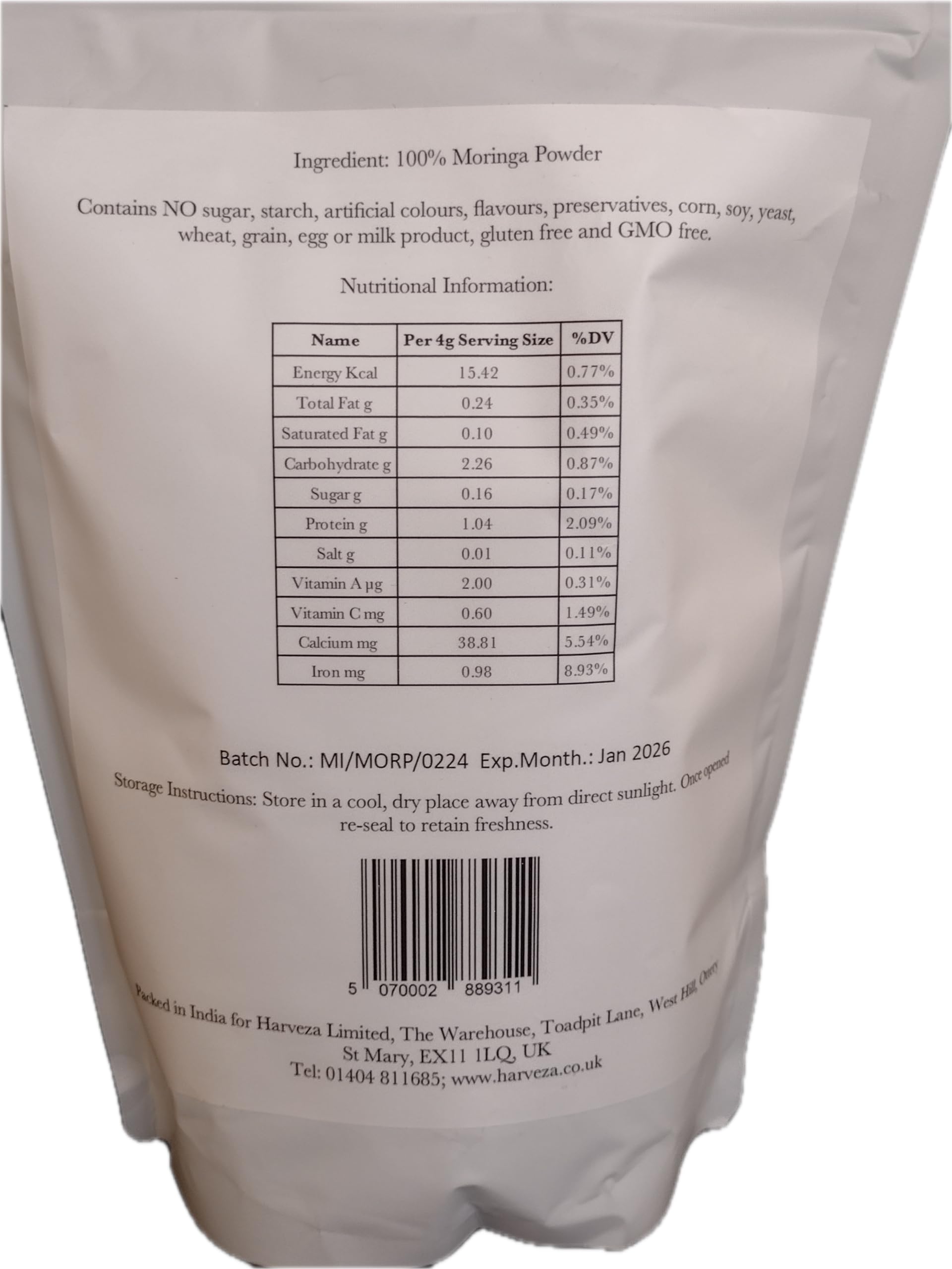 Harveza Pure Moringa Powder, 500g, from The South of India. A Source of Vitamins A and C, Calcium and Iron.
