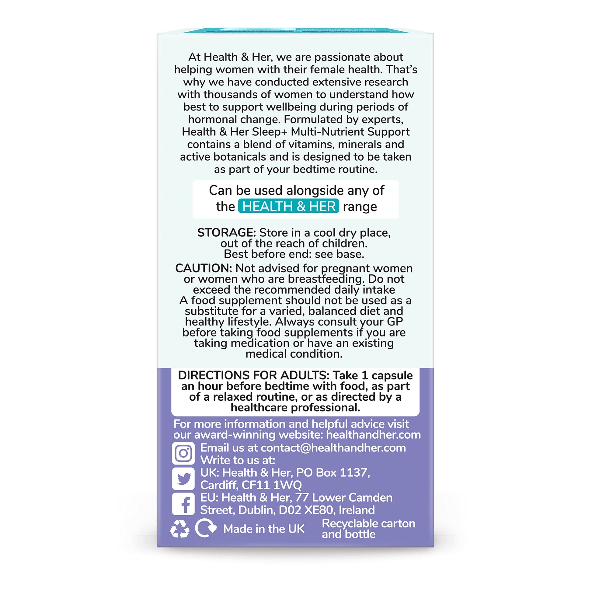 Sleep problems are very common for women, particularly during periods of hormonal change. That's why we have developed the Health & Her Sleep+ Multi-Nutrient Supplement - designed to support women in 5 ways: HORMONE REGULATION Vitamin B6 contributes to the regulation of hormonal activity. NERVOUS SYSTEM Vitamin B6 contributes to the normal functioning of the nervous system. BLOOD SUGAR LEVELS Chromium contributes to the maintenance of normal blood glucose levels RELAXATION Ashwagandha is believed to bring calm, helping support mental well-being and promoting relaxation BEDTIME BLEND Our experts have selected two amino acids for this bedtime blend L-Glycine, and L-Taurine LAVENDER, CHAMOMILE, SAGE AND SOUR CHERRIESMore Info