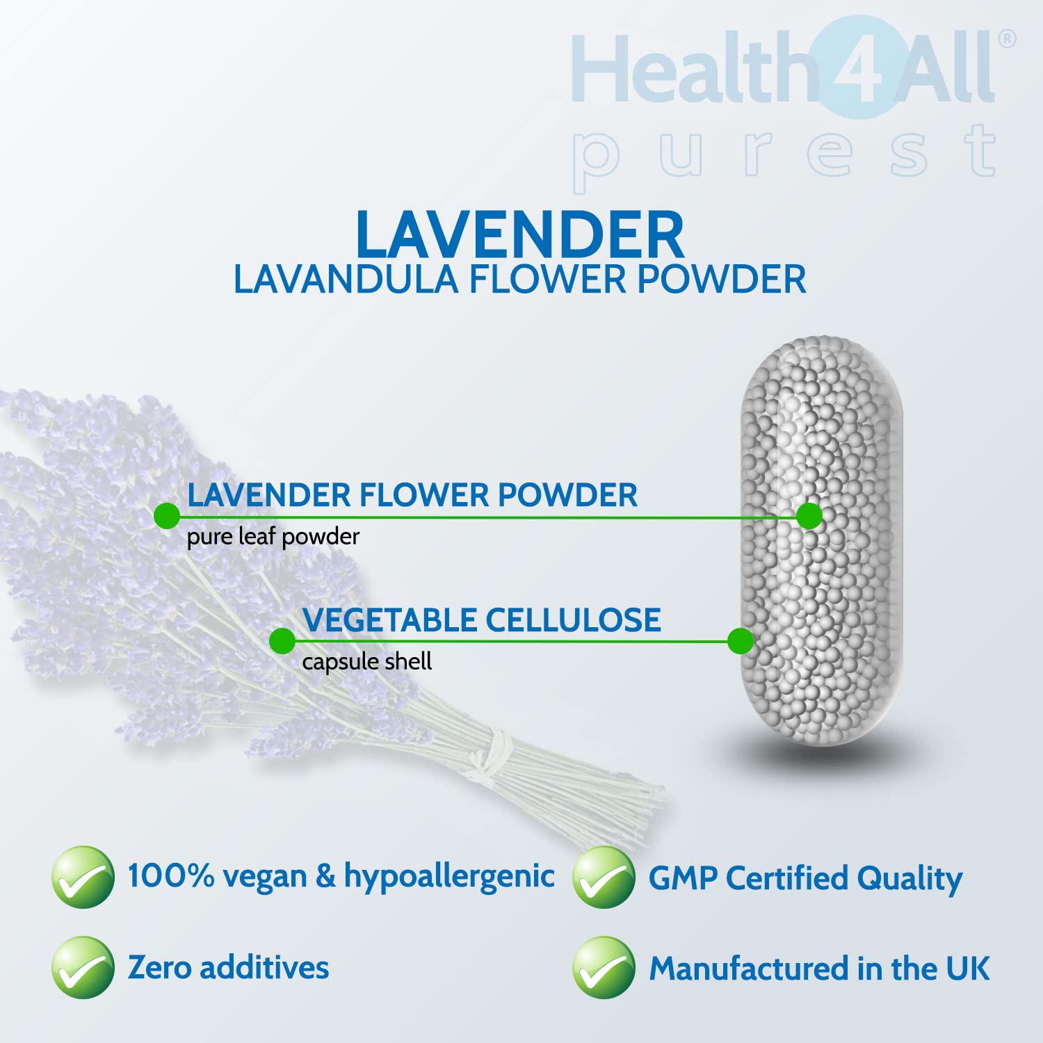 Introducing Health4All's Purest formula of Lavender Capsules, an Anti-Anxiety supplement designed to support your emotional wellbeing. Our pure formula provides the calming benefits and stress-relieving properties of lavender oil making it an ideal solution for those struggling with anxiety and stress. Our Lavender Capsules consist of pure lavender flower, precisely formulated to combat stress and anxiety, making it an ideal anxiety relief supplement. Further, our specially designed Lavender capsules also work as a rescue remedy during high-stress situations. These stress and anxiety capsules provide immediate relief, helping you stay calm and focused. They can be used as a daily supplement or on an as-needed basis, offering flexibility for your unique needs. In addition to being a powerful anti-anxiety supplement, our Lavender Capsules also work as a sleep aid, making them the perfect alternative to traditional sleeping tablets. Health4All's anti-anxiety Lavender supplement is vegetarian and vegan-friendly, making them a suitable choice for everyone. We also ensure our products are free from artificial additives, offering you a pure and natural solution for anxiety relief. You won't find here harmful aluminium lacquers or other additives, just a pure lavender flower in vegetable cellulose capsule. Experience the calming effects of lavender and say goodbye to stress and anxiety with Health4All's Lavender Capsules. Whether you need a daily supplement to manage stress or a rescue remedy for high-pressure situations, our anti-anxiety supplement provide the relief you need. Discover the power of lavender and enjoy a calmer, more peaceful life with Health4All.More Info