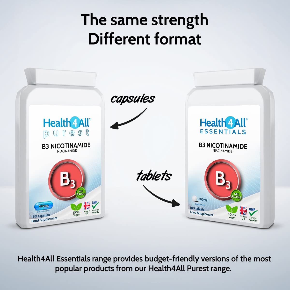 Health4All Vitamin B3 Niacin as Nicotinamide (Niacinamide) 500mg 90 Capsules (V) Purest, No Additives, Vegan, Gluten Free No-Flush Niacin Capsules