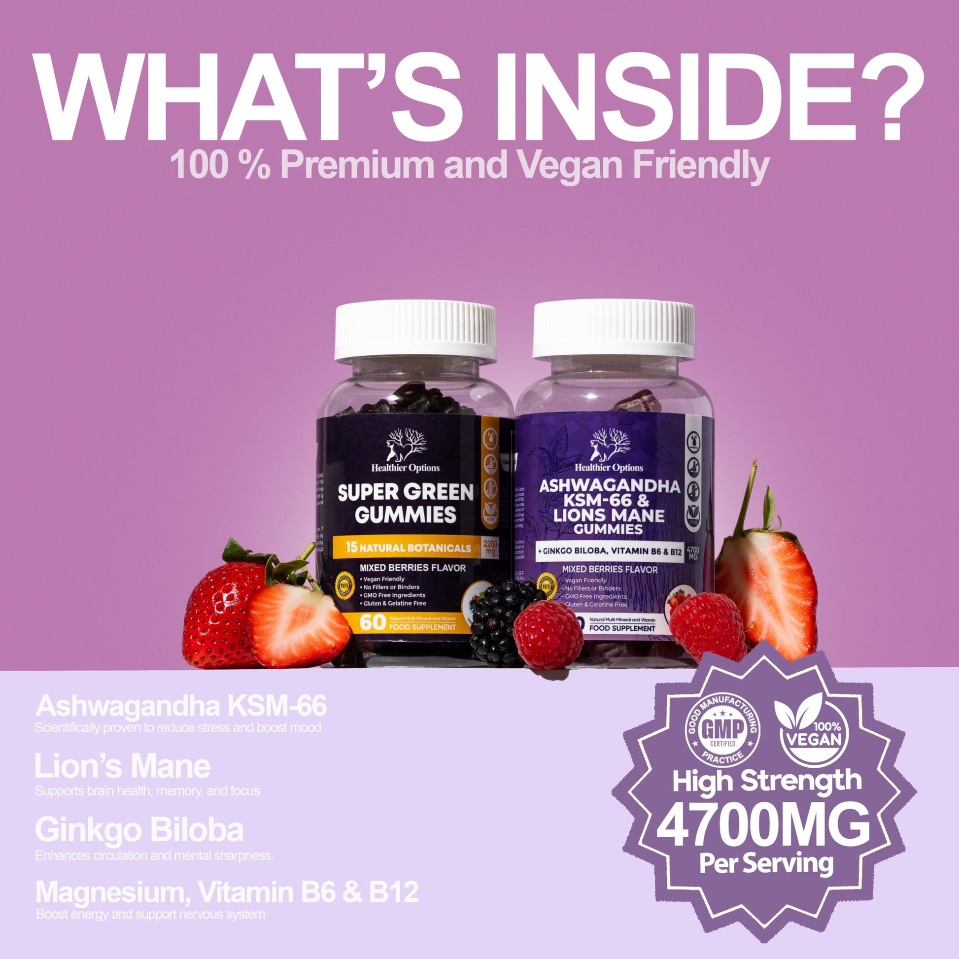 * HEALTHIER NATURAL MULTIVITAMIN – The powerful combination of ASHWAGANDHA KSM-66, LION'S MANE, and GINKGO BILOBA makes our Gummies the ultimate brain and body superfood. These three potent adaptogens and nootropics support stress relief, cognitive function, and overall well-being, providing essential vitamins and minerals to help you thrive. * HEALTHIER & DELICIOUS FLAVOUR – It will now become an EASIER, TASTIER, and PLEASURABLE experience taking your vitamins and minerals! Packed with essential nutrients, these healthy gummies offer a delicious wellness boost in every bite. Our 100% vegan, gluten-free, GMO-free, low-calorie, ZERO sugar gummies are uniquely created to make you look and feel your BEST! * HEALTHIER BRAIN FUNCTION – Enriched with nutrients that support cognitive health, including antioxidants, polysaccharides, and triterpenes from LION'S MANE, our gummies help enhance memory, focus, and mental clarity. ASHWAGANDHA helps manage stress and anxiety, while GINKGO BILOBA promotes improved blood flow and brain function. * HEALTHIER IMMUNE SYSTEM & STRESS RESPONSE – ASHWAGANDHA KSM-66 is renowned for its adaptogenic properties, helping to balance the body’s stress response and boost the immune system. Combined with the immune-supporting benefits of LION'S MANE and GINKGO BILOBA, our gummies are designed to keep you resilient and strong against daily stressors. * THIRD-PARTY LAB TESTED – Each ingredient is quality tested before our manufacturing process begins, and every batch of our gummies undergoes further rigorous quality testing. Our ASHWAGANDHA, LION'S MANE, and GINKGO BILOBA gummies have been third-party tested for purity and potency by UK & Europe's largest testing facilities (Eurofins). The lab is UKAS accredited according to ISO/IEC 17025:2017, ensuring you receive a product of the highest standard.More Info