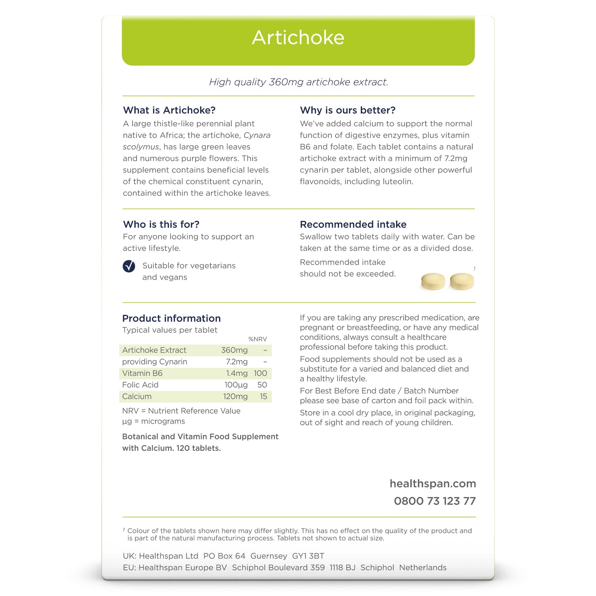 Healthspan Artichoke Extract 360mg (120 Tablets) | Supports Digestion & Liver Health | High Strength Vegan Artichoke Tablets with 7.2mg of Cynarin | with Calcium, Folate & Vitamin B6 | Vegan