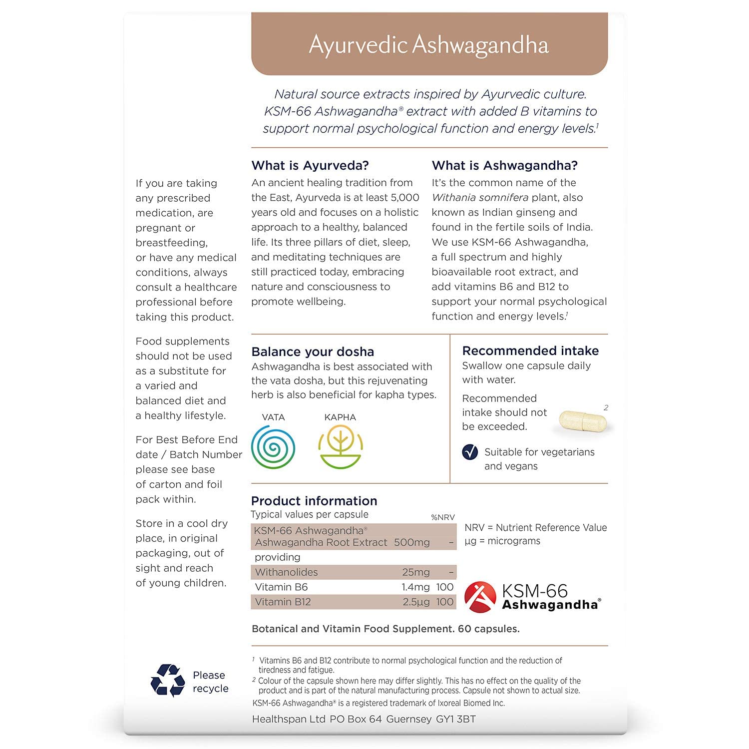 Healthspan Ashwagandha | 60 Capsules | Supports Relaxation & Mental Wellbeing | 500mg KSM-66 Ashwagandha | Added Vitamins B6 & B12 | Ayurvedic | Vegan