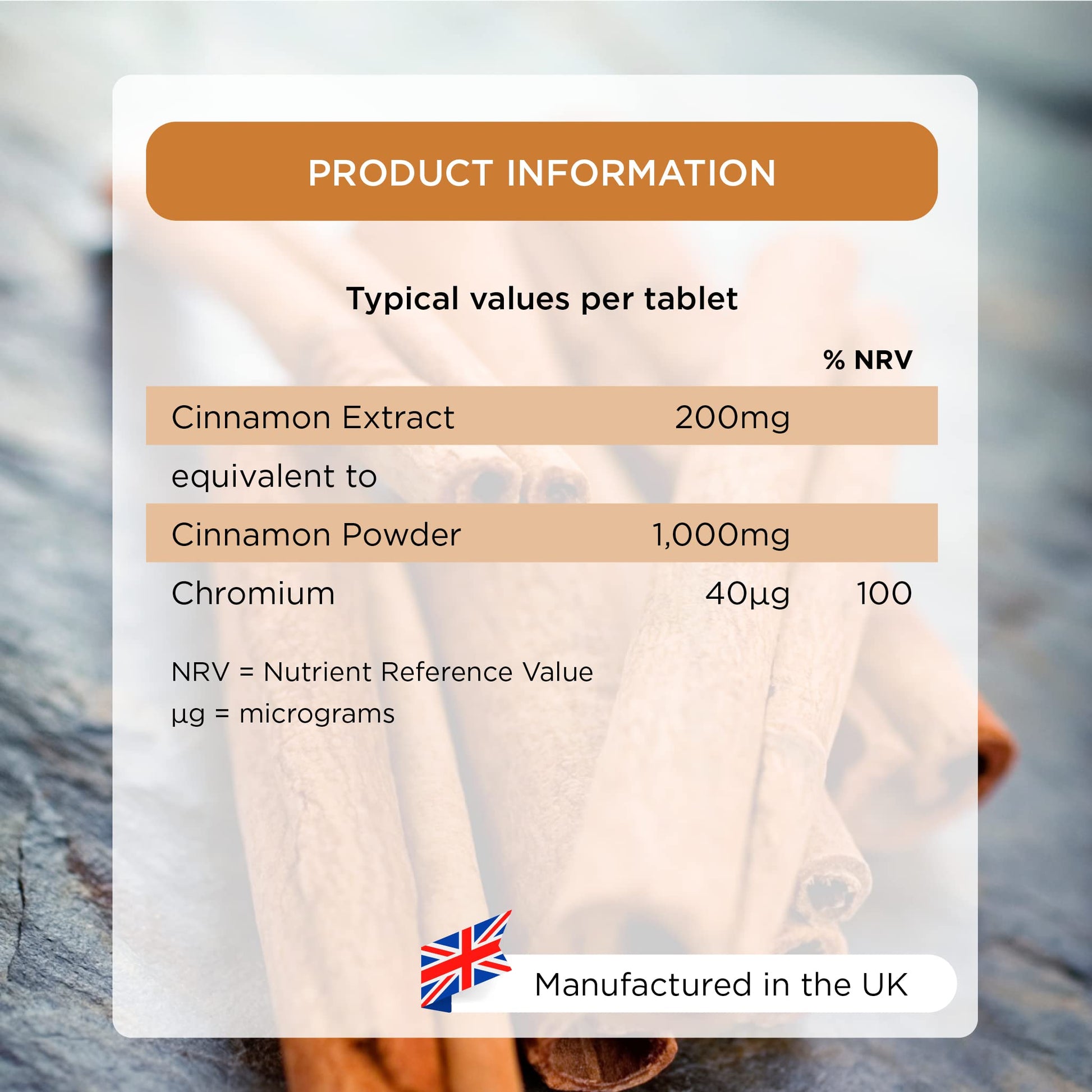 Why Choose Healthspan's Cinnamon 1,000mg?Healthspan's ingredients are rigourously tested for purity to provide the highest quality natural cinnamon. One tablet daily provides 200mg CInnamomum cassia extract, equivalent to 1,000mg cinnamon powder. They've also add chromium to this formulation, which can help to maintain your blood sugar levels and support normal metabolism.