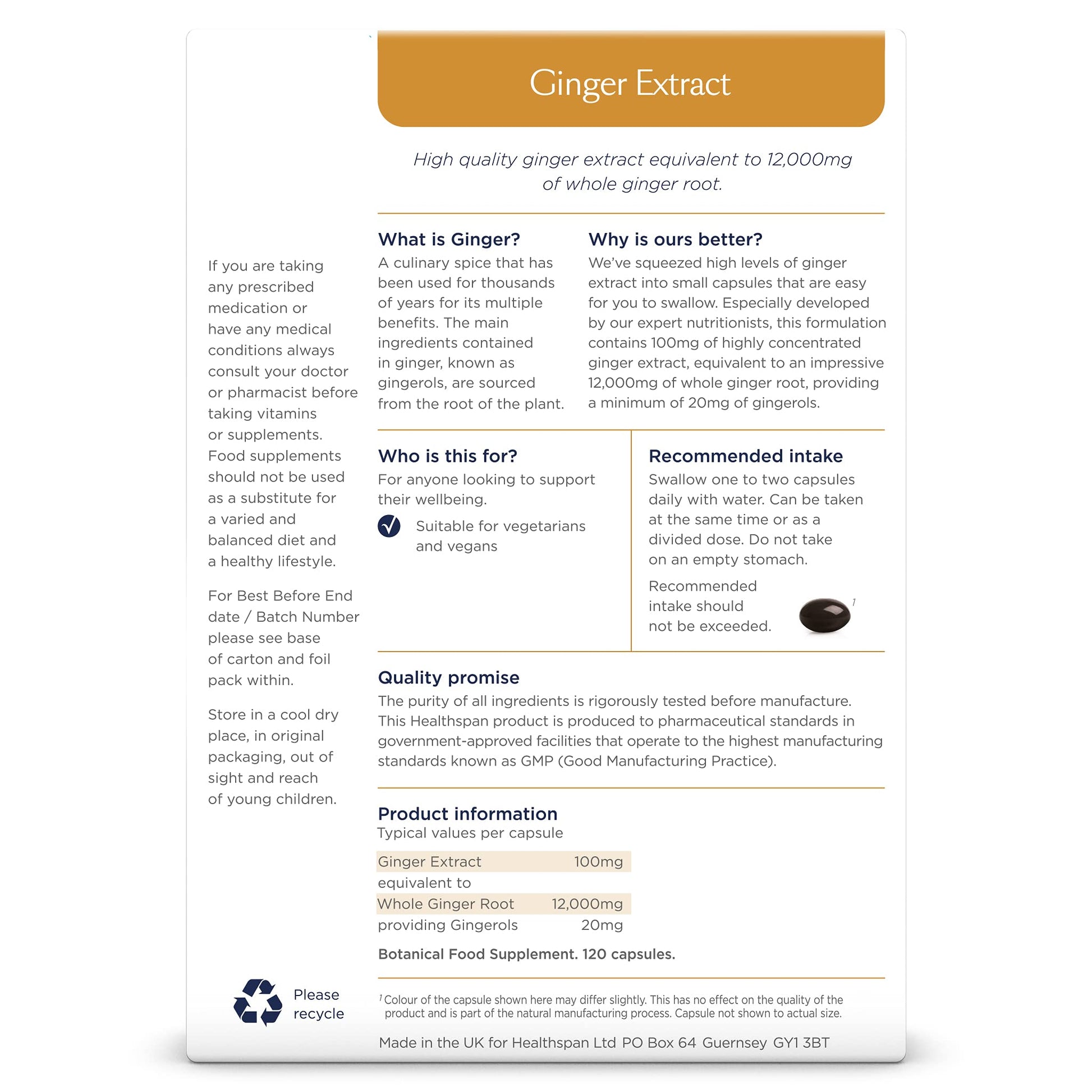 healthspan Healthspan Ginger Extract 100mg (4 Months' Supply) | Support Your Digestive Health | Equivalent to 12,000mg of Whole Ginger Root | Providing 20mg Gingerols | Easy to Swallow Capsules | Vegan
