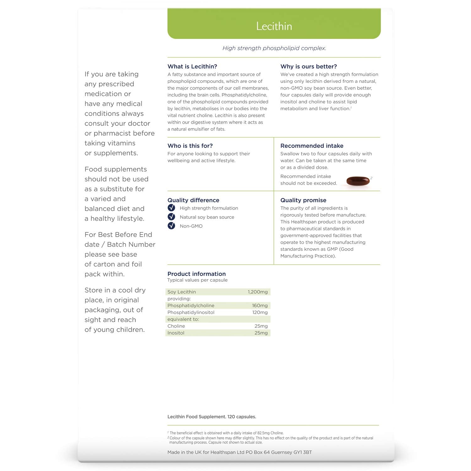 Why Choose Healthspan's Lecithin?Healthspan only use lecithin from soya beans, which is one of the most concentrated and unrefined sources. They also make sure it’s non-GMO as we know that many of their customers don’t wish to consume nutrients from genetically modified plants. Plus, the full dose of four capsules provides enough choline to have a beneficial effect on fat digestion and liver function.