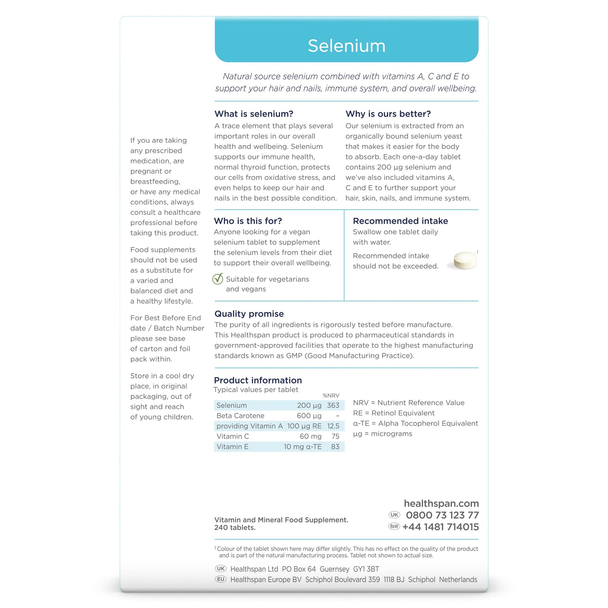healthspan Healthspan Selenium | 240 Tablets | Highly Absorbable | with Vitamin C, A & E | Hair, Nails and Skin Health | Vegan