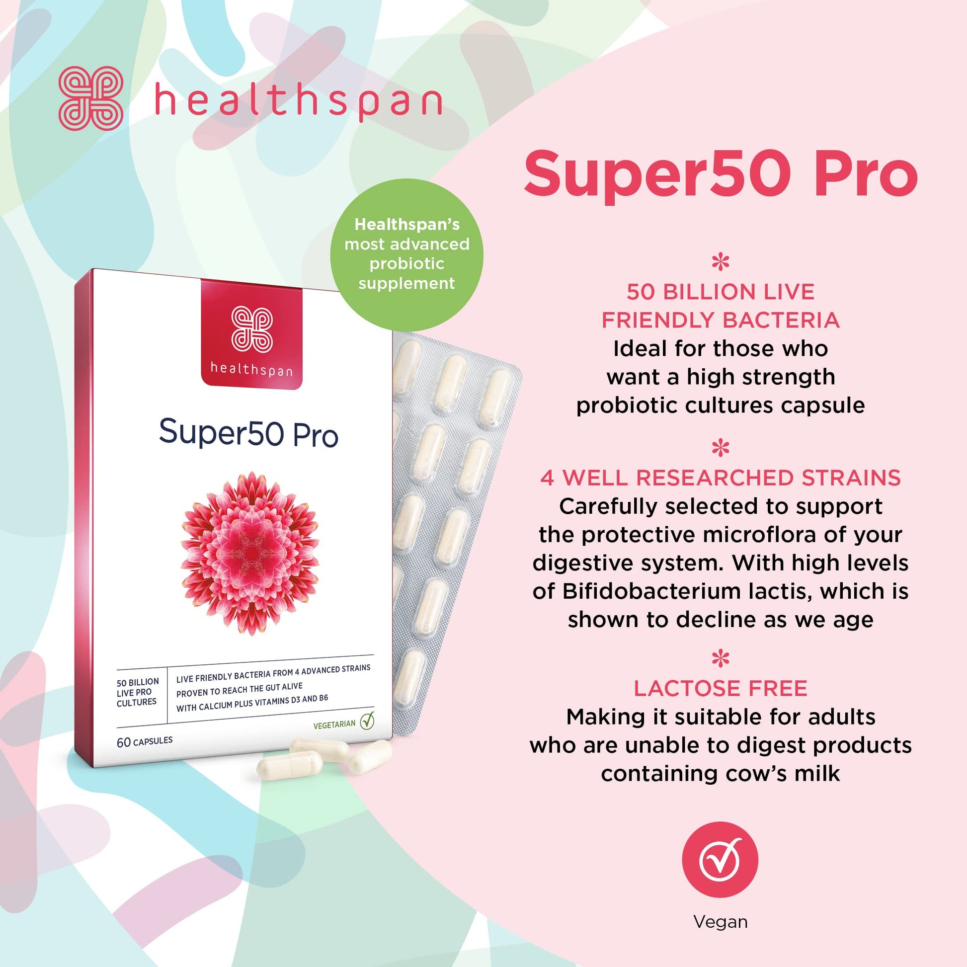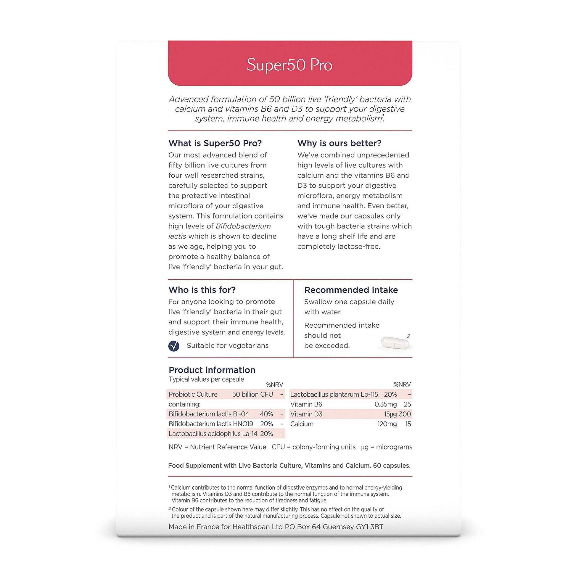 Why Choose Healthspan’s Super50 Pro?They've combined 50 billion live cultures with calcium and vitamins B6 and D3 to provide comprehensive support.