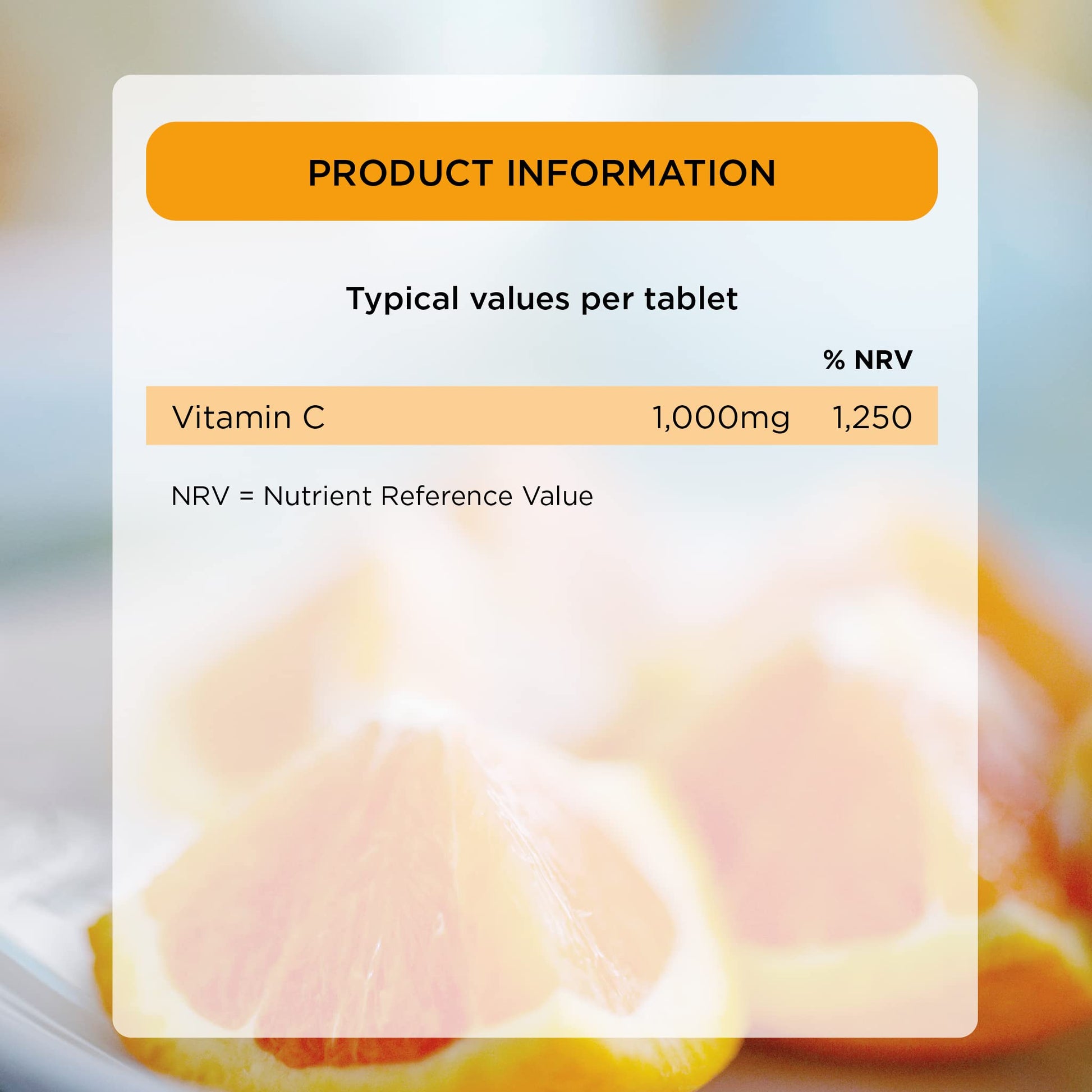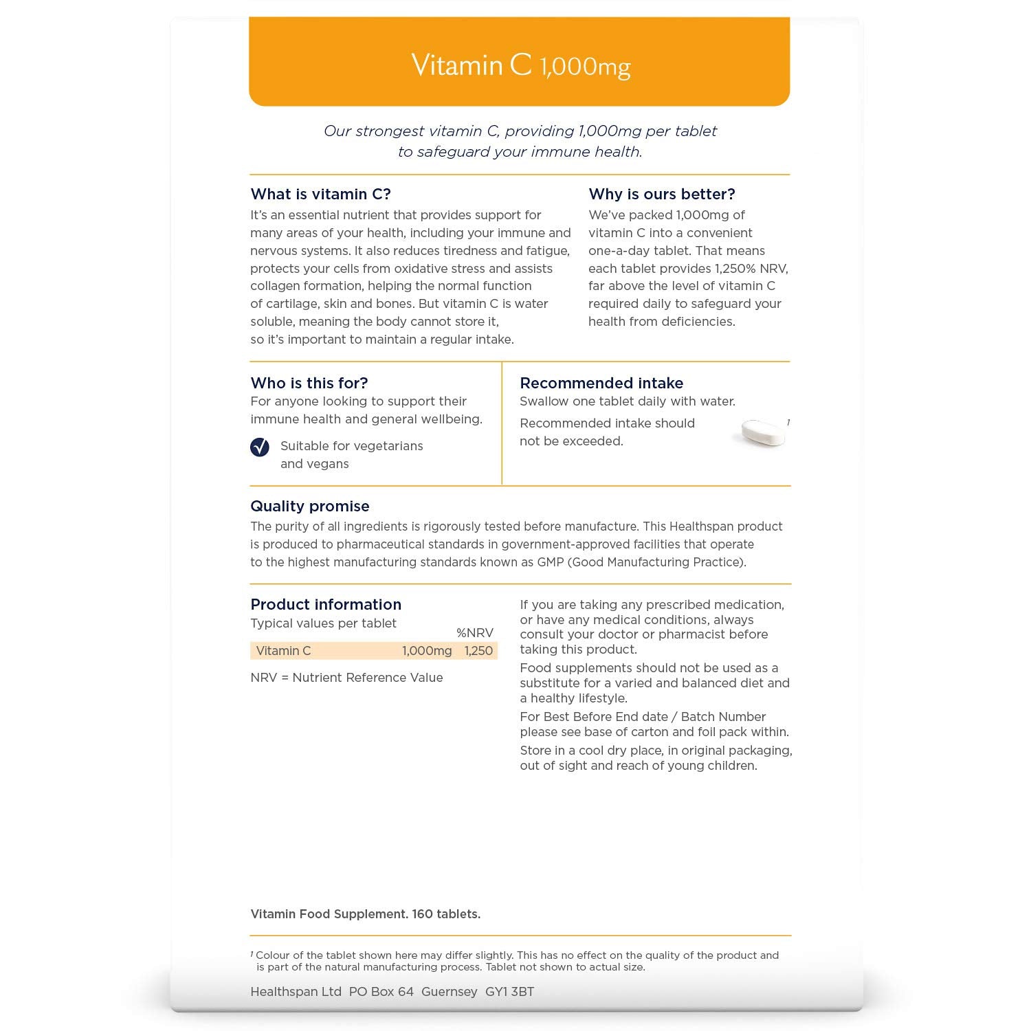Why Choose Healthspan's Vitamin C 1,000mg?Vitamin C 1,000mg is Healthspan's strongest vitamin C supplement. They've packed 1,000mg of vitamin C into a convenient one-a-day tablet. That means each tablet provides 1,250% NRV, far above the level of vitamin C required daily to safeguard your health from deficiencies.