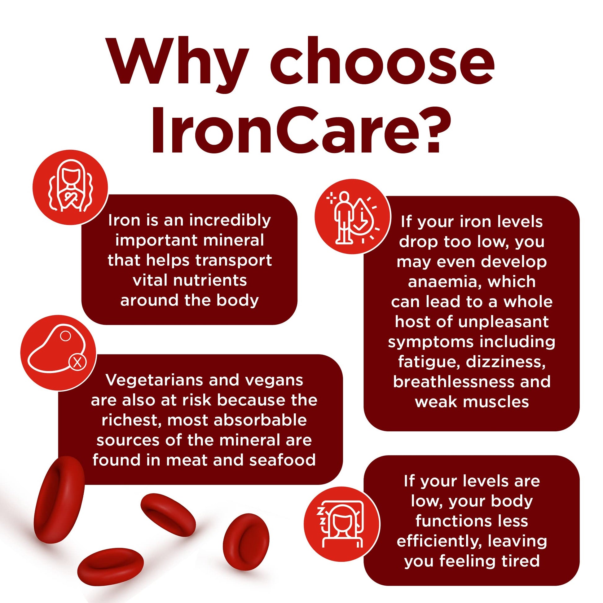 What is IronCare?Iron is an incredibly important mineral that helps transport vital nutrients around the body. If your levels are low, your body functions less efficiently, leaving you feeling tired. If your iron levels drop too low, you may even develop anaemia, which can lead to a whole host of unpleasant symptoms including fatigue, dizziness, breathlessness and weak muscles.