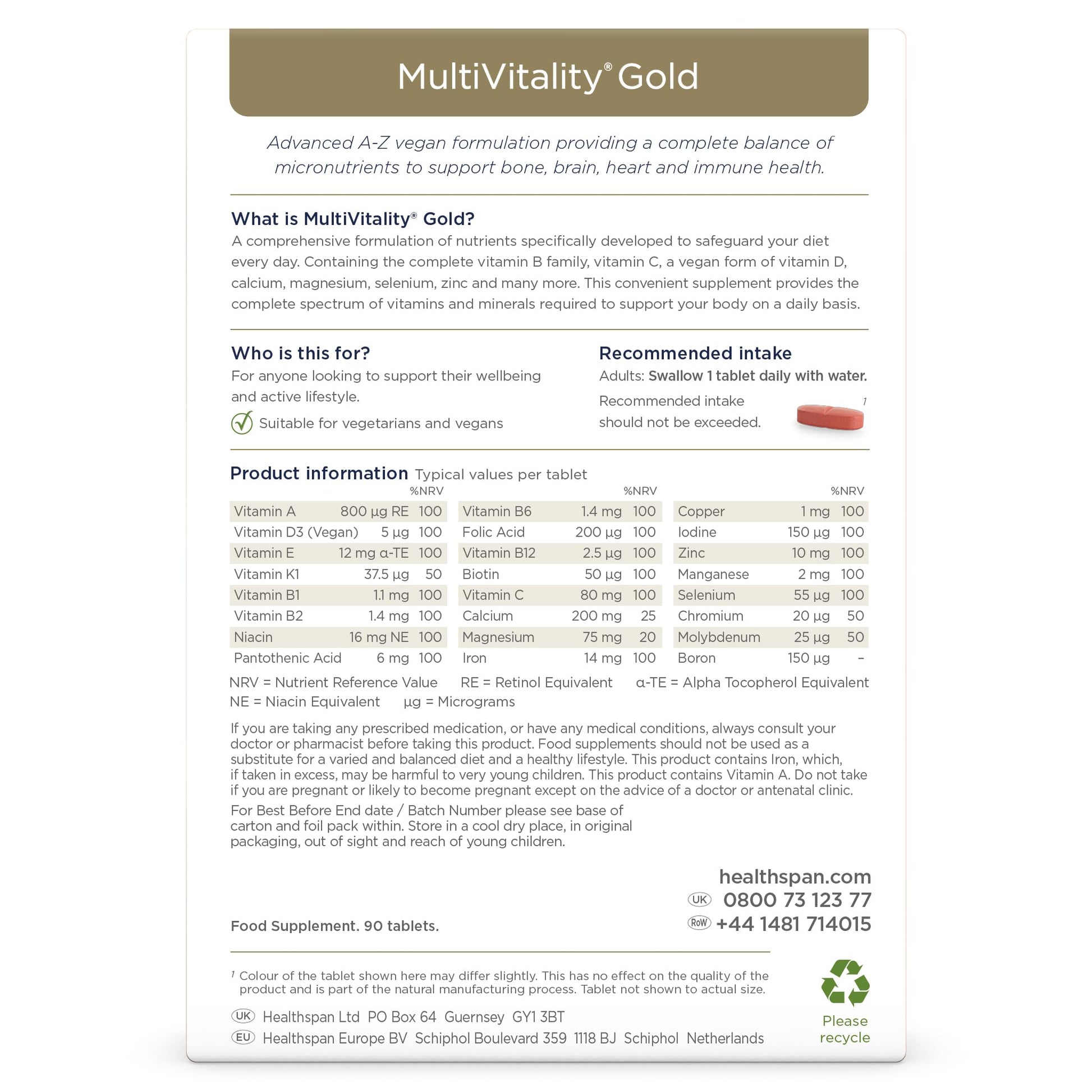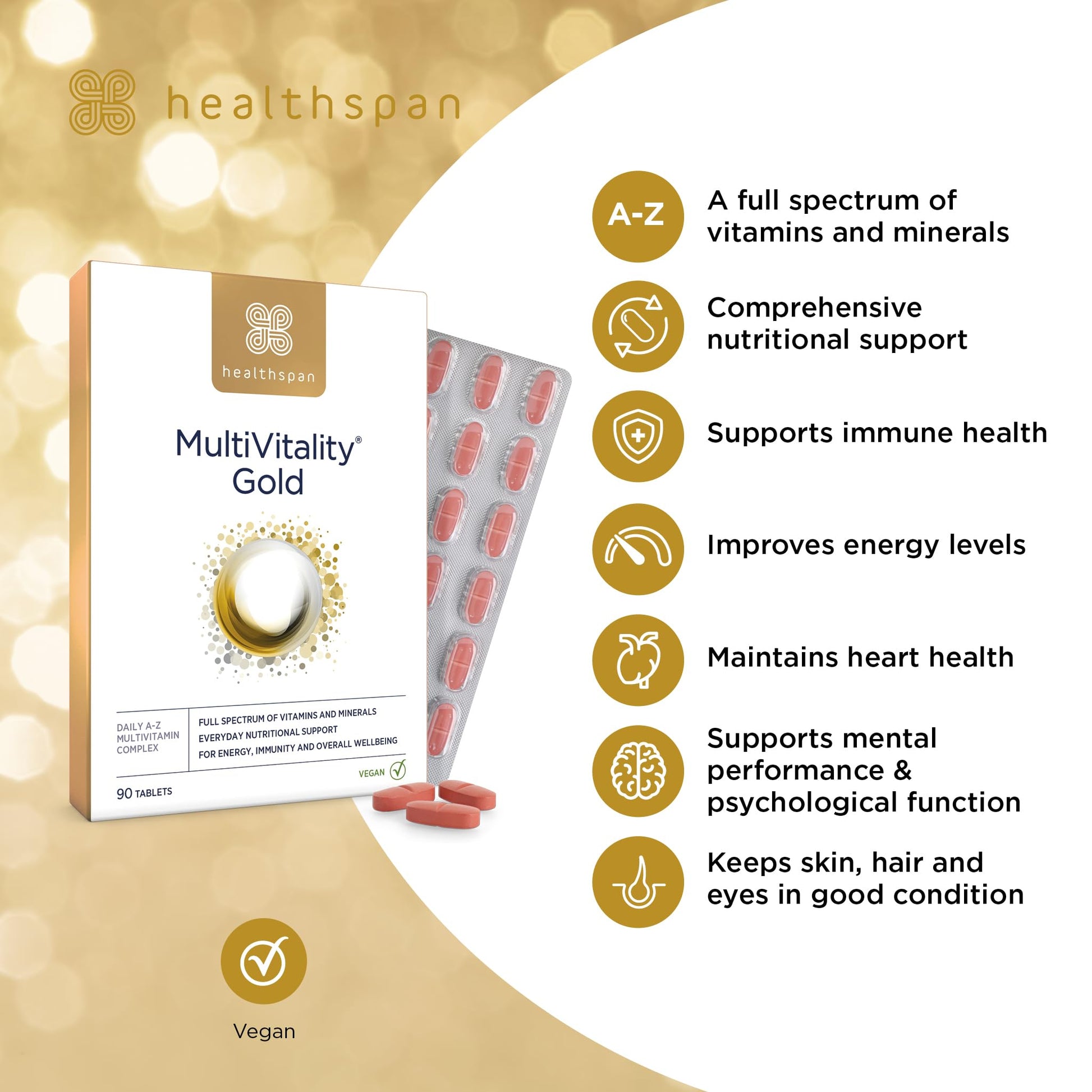 Healthspan Multivitamin Gold (90 Tablets) | A-Z Formulation | Wellbeing & Immune Support | Algal Source Vitamin D3 | Vitamins A, B, C, D, E & K | Calcium, Iron, Magnesium, Selenium & Zinc | Vegan