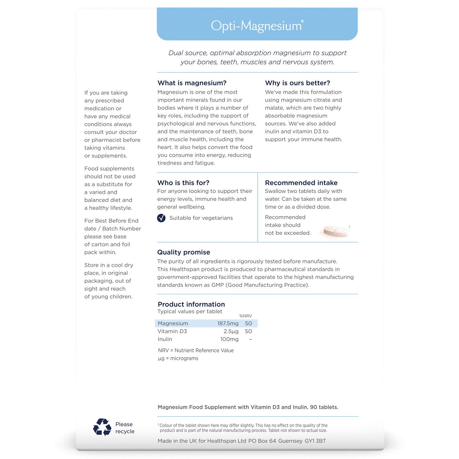 Healthspan Opti-Magnesium | 90 Tablets | for Bone & Muscle Support | Maintains Psychological Function and Nervous System | Easily Absorbed | Added Vitamin D3 | Inulin | Vegetarian