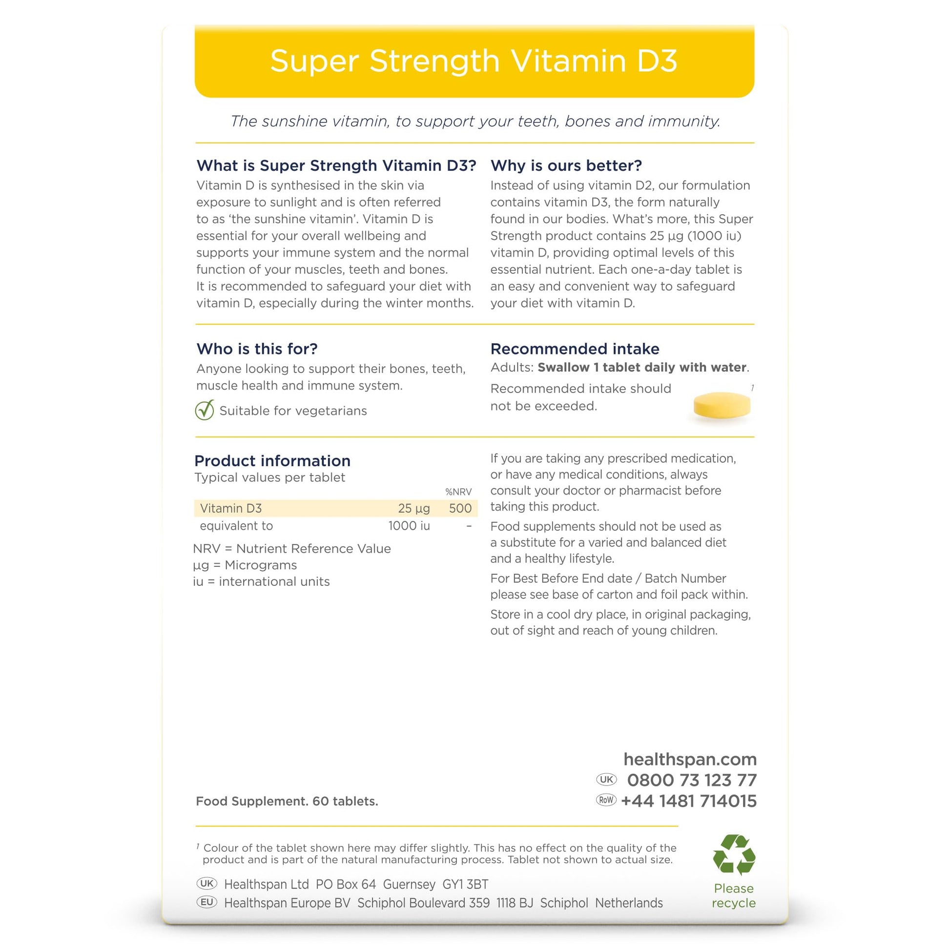 Healthspan Super Strength Vitamin D3 | Immune Health | Bone, Teeth & Muscle Health | Contains 1,000iu of Natural Source Vitamin D3 in Each Tablet | Vegetarian (60 Tablets)