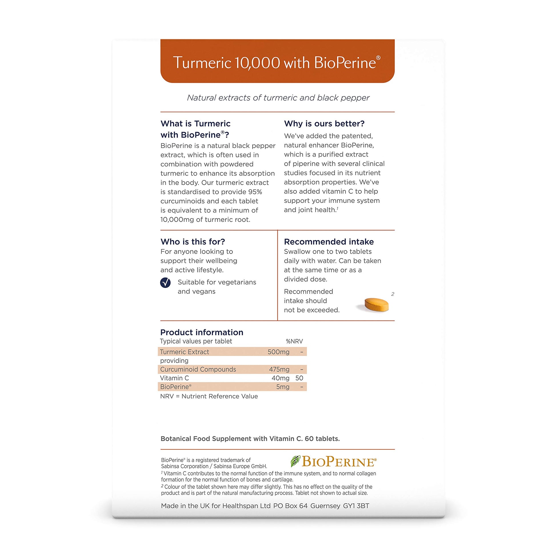 Healthspan Turmeric 10,000mg with BioPerine Black Pepper Extract (2 Months’ Supply) | High Potency Turmeric Extract | Supports Immune, Bone & Cartilage Health | BioPerine aids Absorption | Vegan