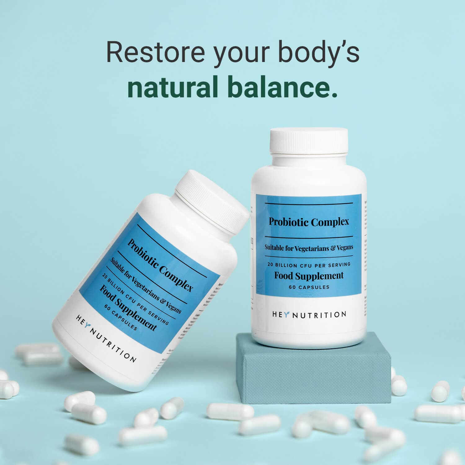 Hey Nutrition Probiotic Complex Supplement - 20 Billion CFU - Suitable for Vegetarians & Vegans - Supports Gut & Skin Health, Improves Immune Response - UK Manufactured - 60 Vegan Capsules